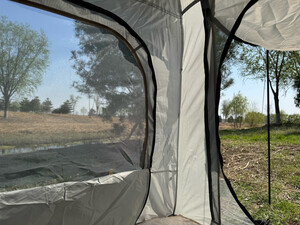 第一次野营搭帐篷,没想到这款很容易,自己像伞一样张开了,对照京东上的商品视频,很快完成,帐篷里再铺上另外购买和准备的隔潮垫,或躺或坐在里边很是舒服,青草的清香,青蛙鸣叫,体验很棒。