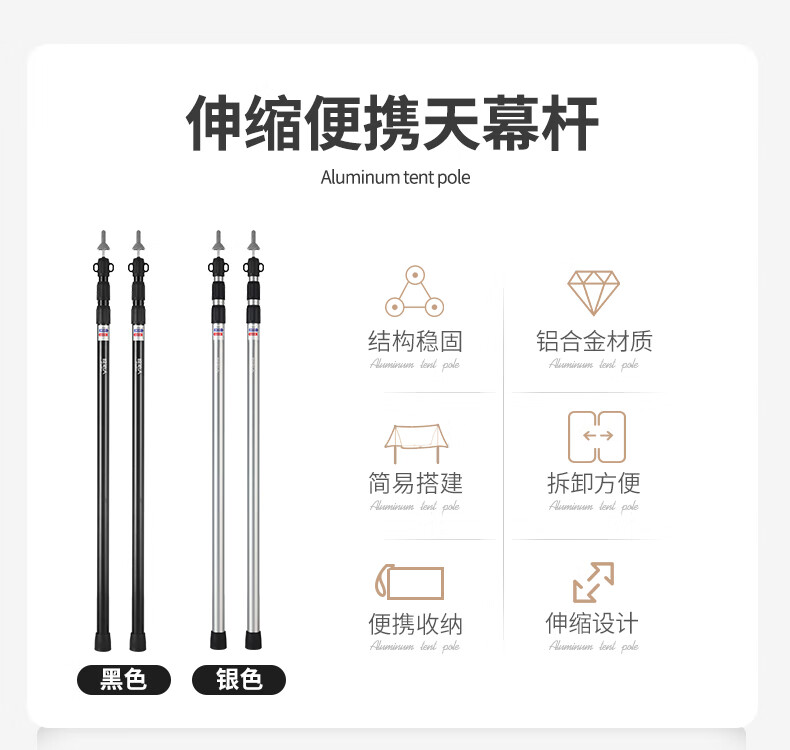 驴小贝户外露营天幕杆加粗铝合金可伸缩调节门厅支撑杆架帐篷配件 2.3米银色1根