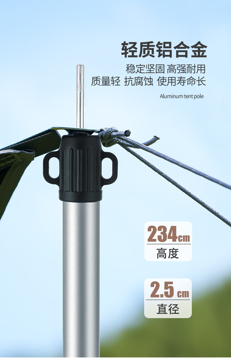 如果是中号人字帐篷的话,这两根撑杆适合于放中间,高2米34,两边4个角,视情况,可直接拉绳固定,或者放两根撑杆再拉绳,铝合金的,但有点分量比较扎实,伸缩杆长度任意调节,可以锁死
