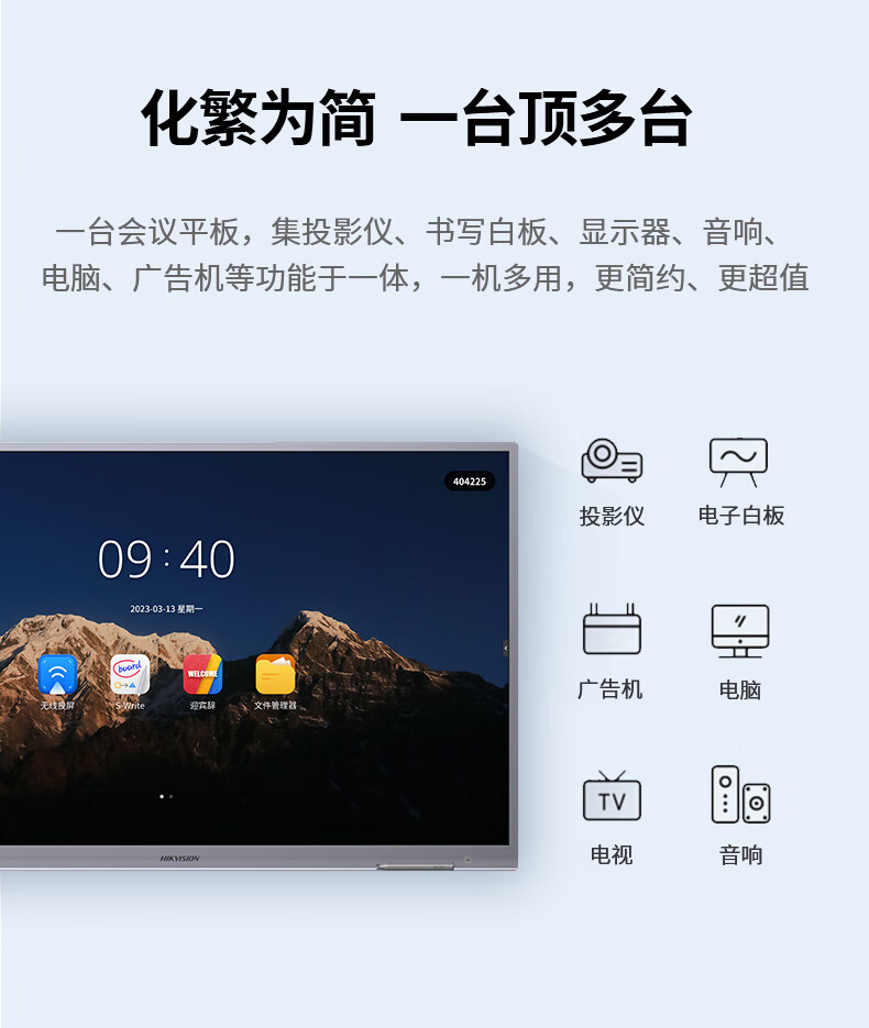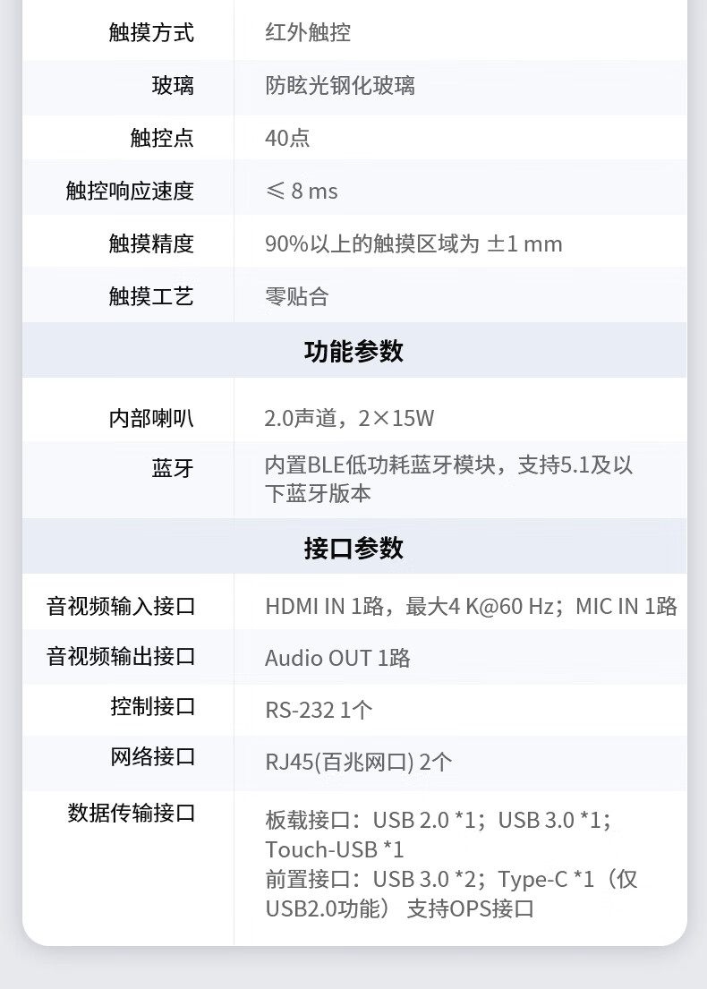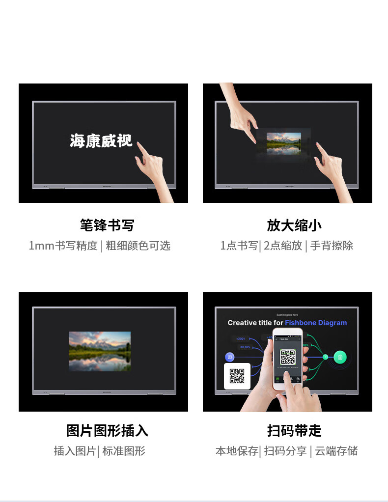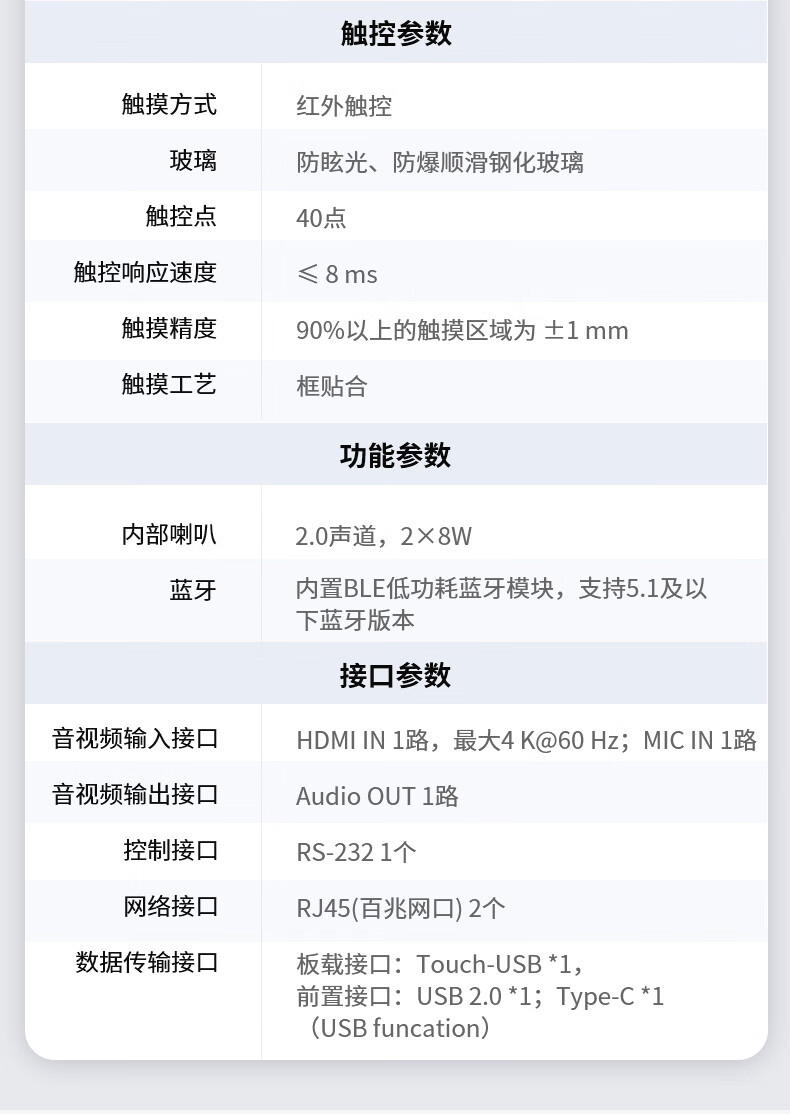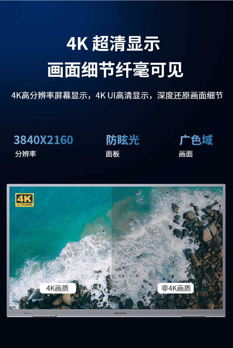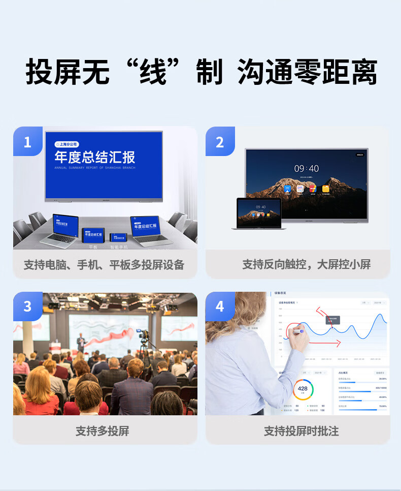 性价比很高,适用性很强,公司搞活动或接待客人的时候 用于宣传体面大气上档次。4K画面很清晰,比投影仪啥的方便太多了,效率高了不少,在开会的时候演示标注的重点,还可以到最后结束的时候直接扫码带走记录或者直接分享给员工,对于我们公司来说真的太有用了