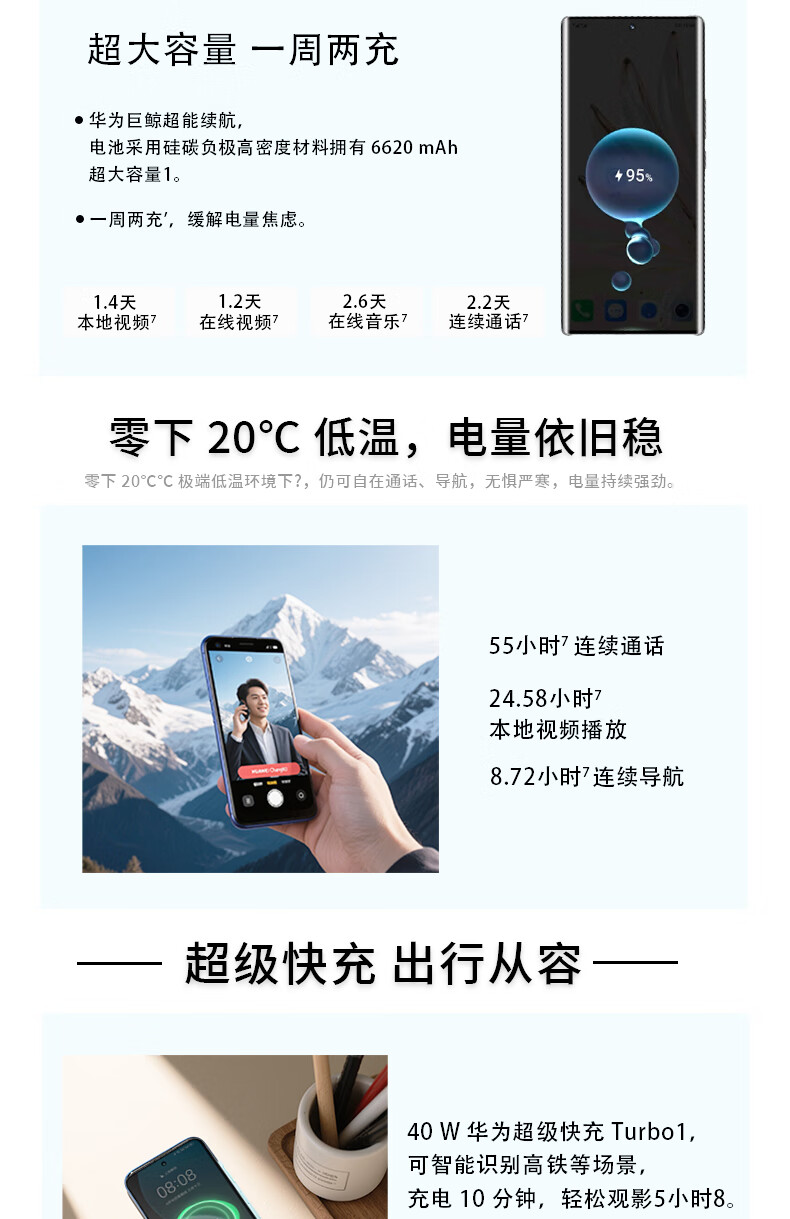 1、手机(内置电池)× 1; 2、华为SuperCharge充电器(Max 40W) × 1; 3、USB Type-C 数据线 × 1; 4、保护膜(出厂已贴在手机上) × 1;5、快速指南 ×1