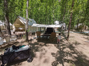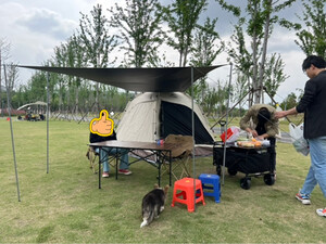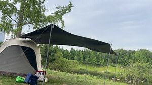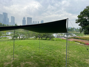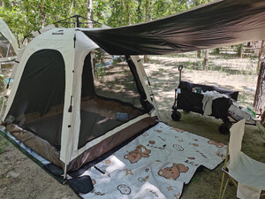 防水效果:还没试过,感觉四面通风如果下起雨来估计会不是那么防水 适用场景:适用于公园防晒露营、过夜无雨露营、休闲露营⛺️ 容纳人数:帐篷内可以四到五人、帐篷外可以五六个人,适合一大家子出行 透气效果:四面都可以通风,比较透气 展开类型:很好,如图 便携性能:方便,帐篷、天幕都有了!