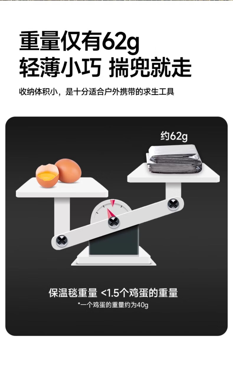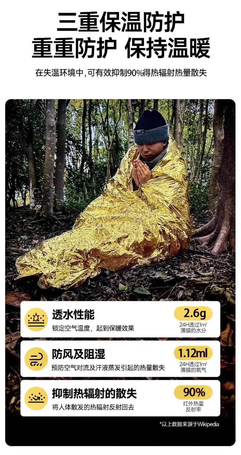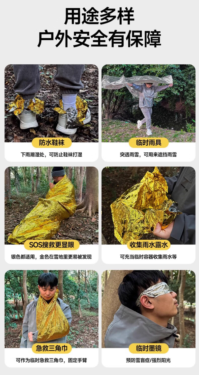 这款户外神器真的超实用!轻便易携带,关键时刻能保暖救命。材质结实耐用,折叠后不占地方,适合登山露营随身带。用过几次,保温效果不错,性价比很高。