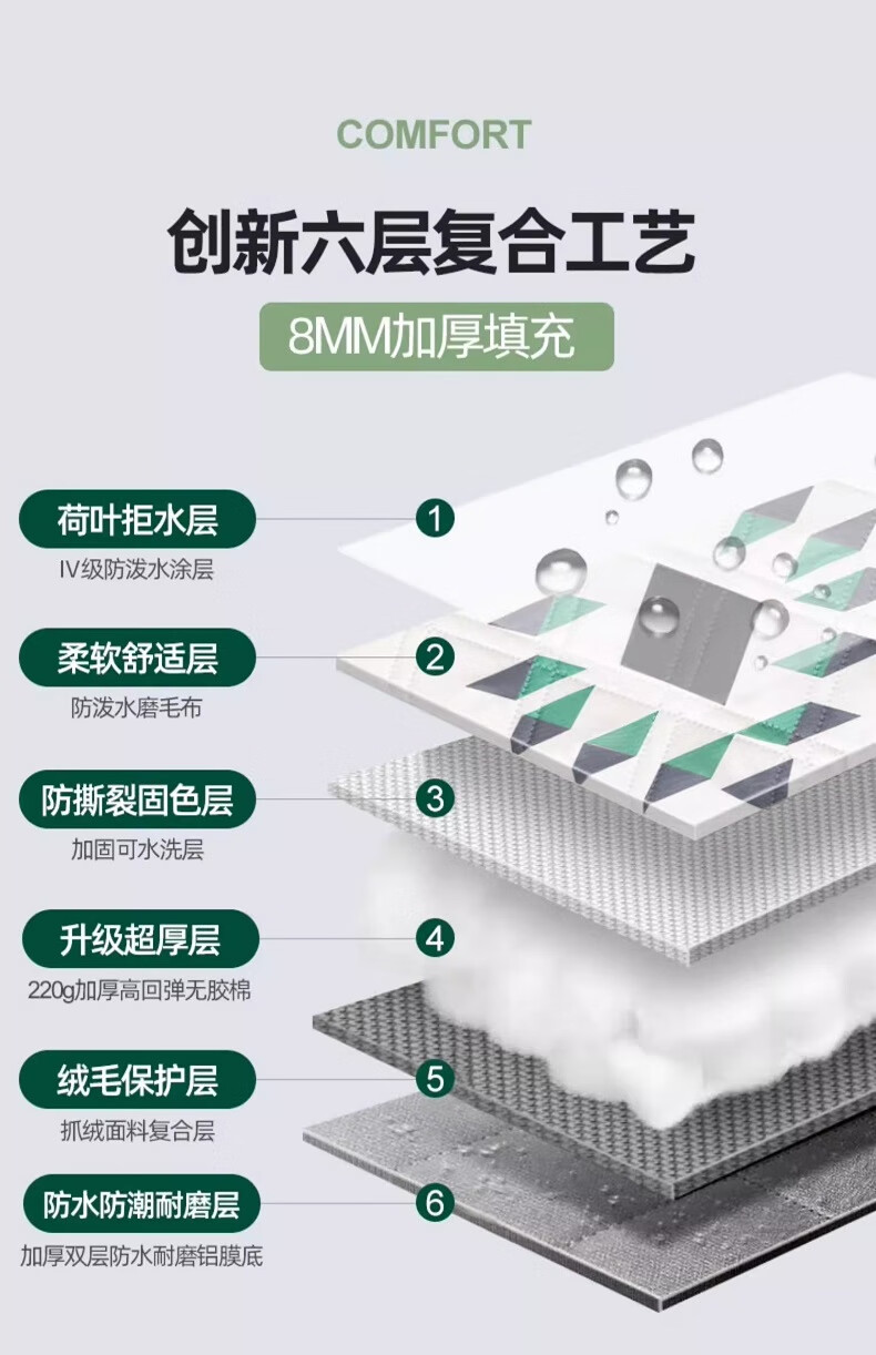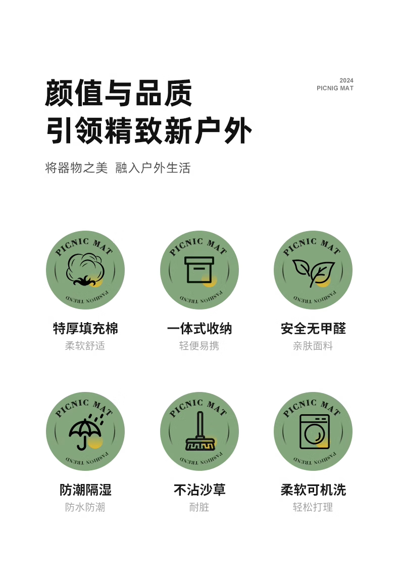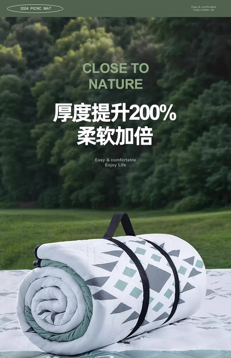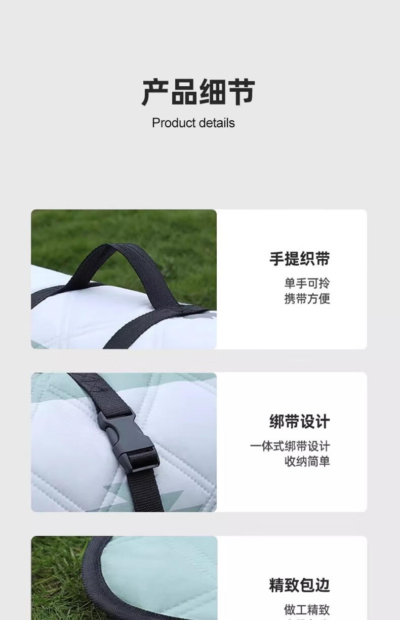 防雨防水,坐在草坪上很舒服,一款随身随车可折叠收纳的户外野餐垫,厚度合适,关键物流很快包装精美无破损,是喜欢的户外用品,不错的选择