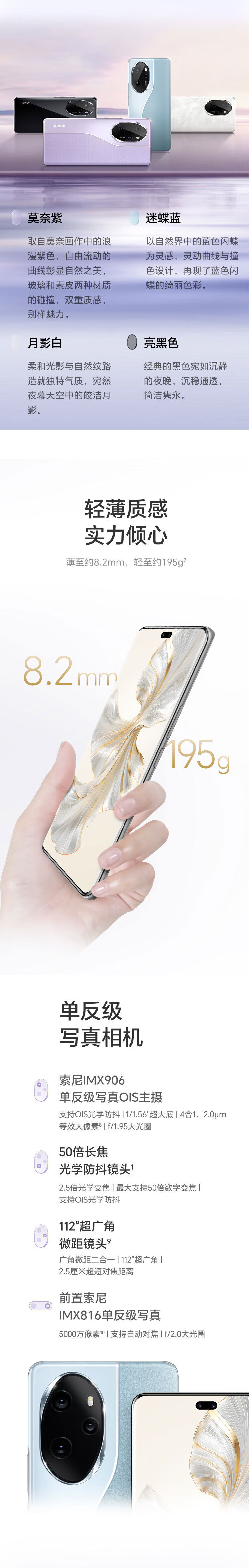 荣耀(HONOR)100 Pro 第二代骁龙8+旗舰芯片绿洲护眼屏 5G手机 迷蝶兰 16GB+256GB 单机+第三方品牌充电器+店保1年