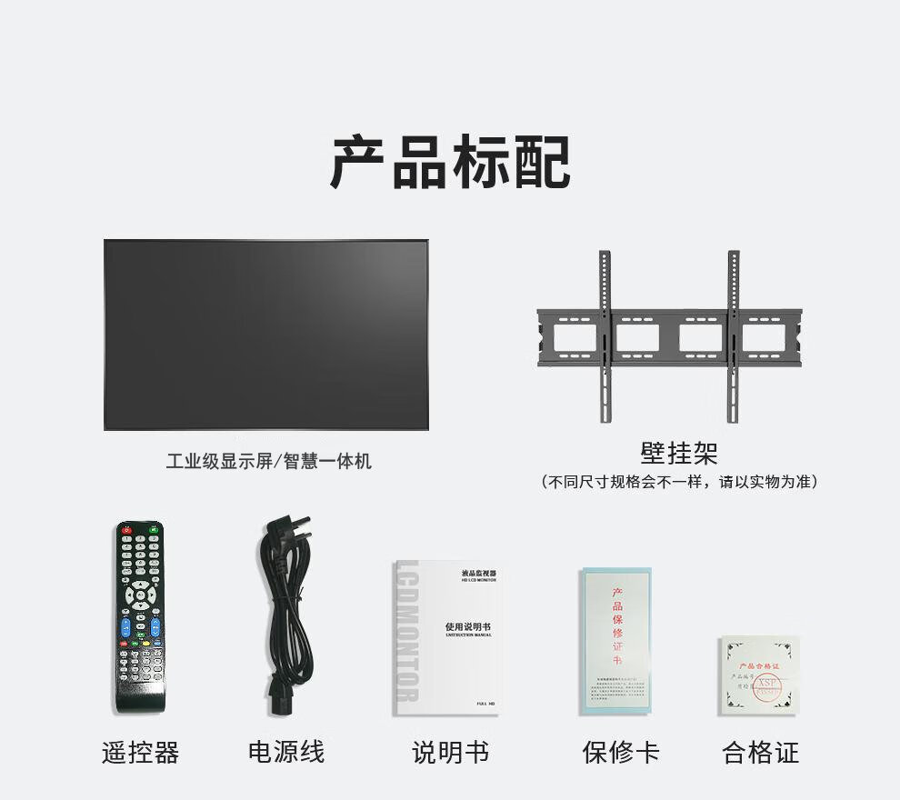 包装配件:整机*1,壁挂件*1,电源线*1,遥控器*1,说明书*1,保修卡*1,合格证*1。