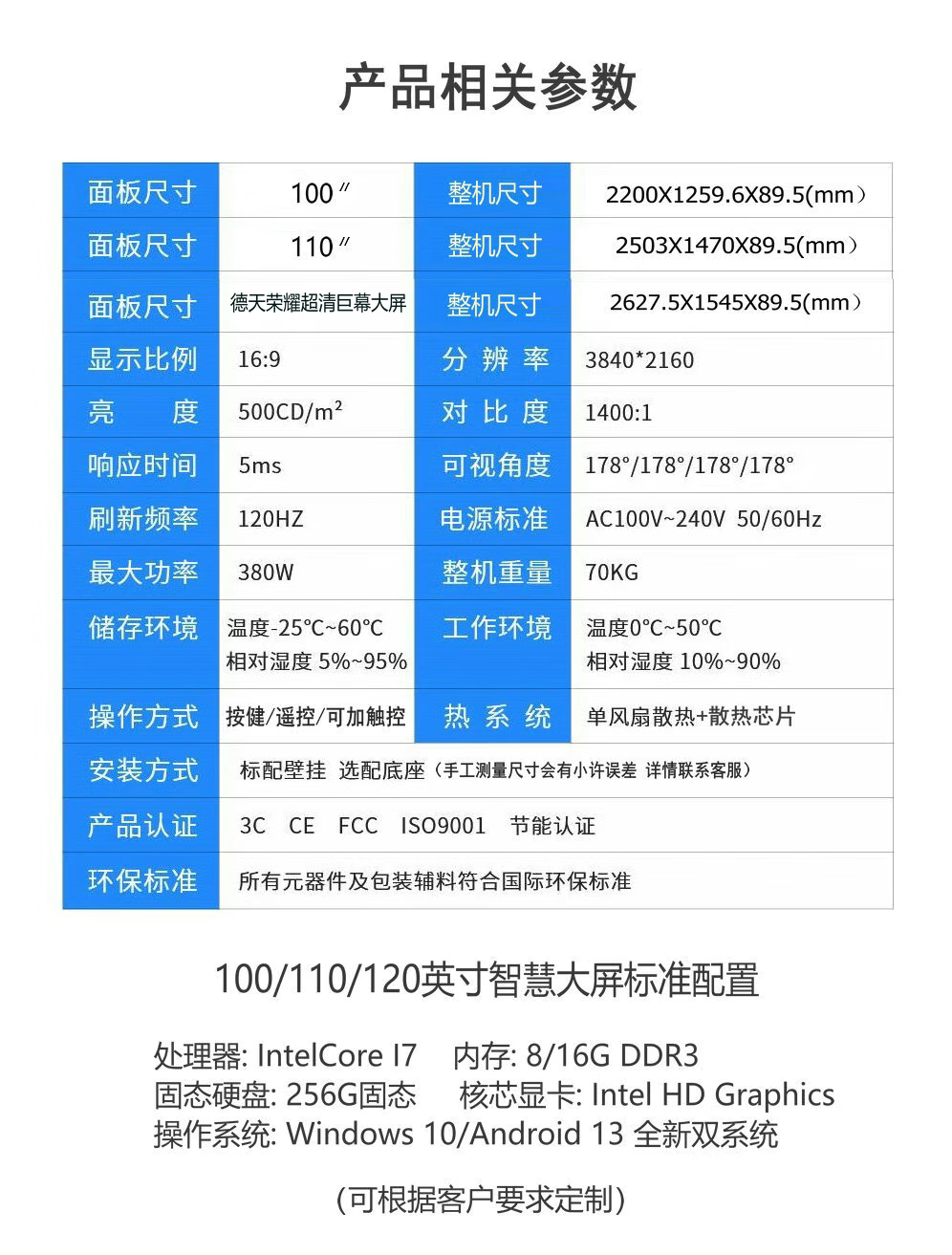 德天 100/110/120英寸国标工业级智能4K高清液晶显示器会议一体机监控办公展览展示电视防爆屏幕包安装 100英寸显示屏支架