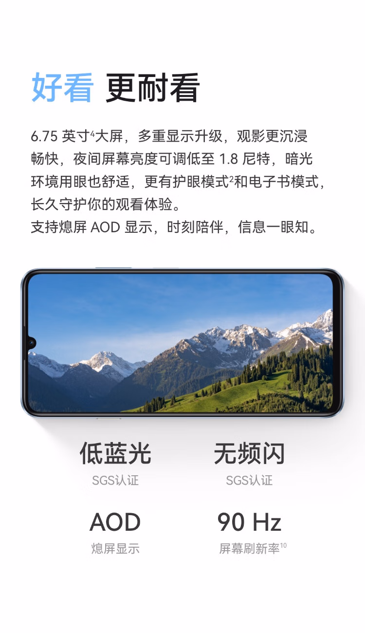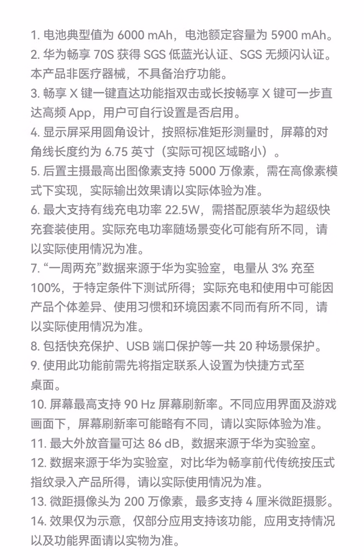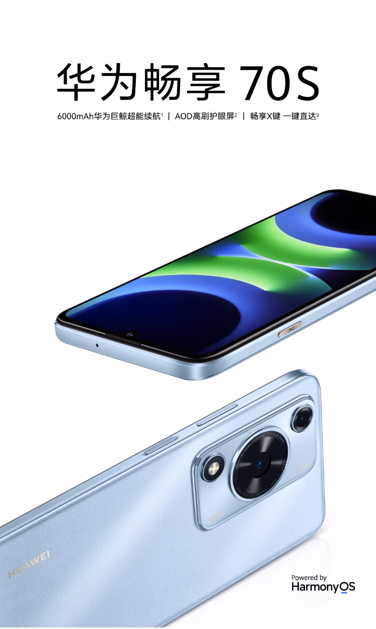 • 华为 畅享 70S 6.75英寸AOD护眼大屏 6000mAh大电池长续航 畅享X键 鸿蒙系统 老人 学生 智能 4G手机 冰晶蓝 8GB+256GB