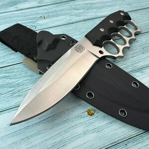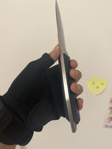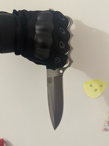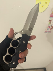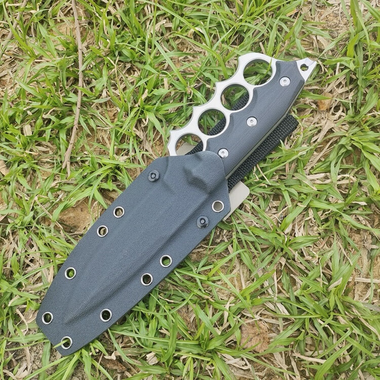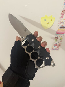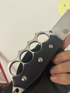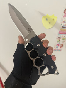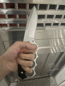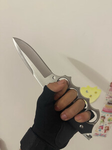 很战斗的指虎刀,像那种地下格斗使用的风格,指环很坚硬,指孔不是很小,我一个成年人带上手套还有多余的缝隙,刀刃可以扎铁皮,硬度还是很够用的,重量也不算重,准备再买一个凑一对