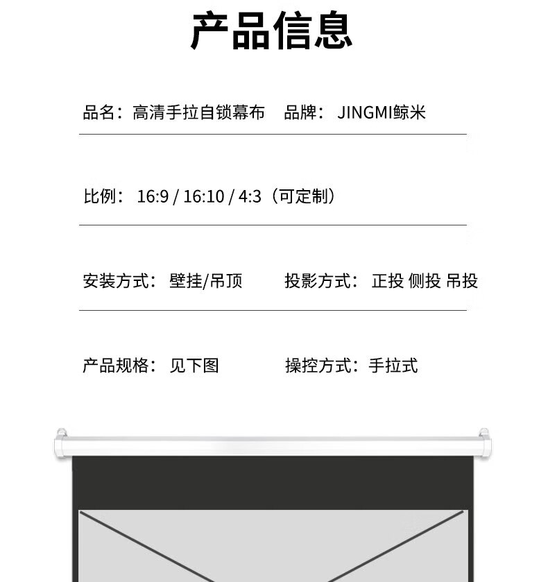 鲸米(JINGMI)手拉自锁投影幕布家用高清电影白塑白玻纤手拉升降办公家用教育培训投影仪幕布投影机屏幕 神州系丨S1白塑手拉幕 120英寸16:9