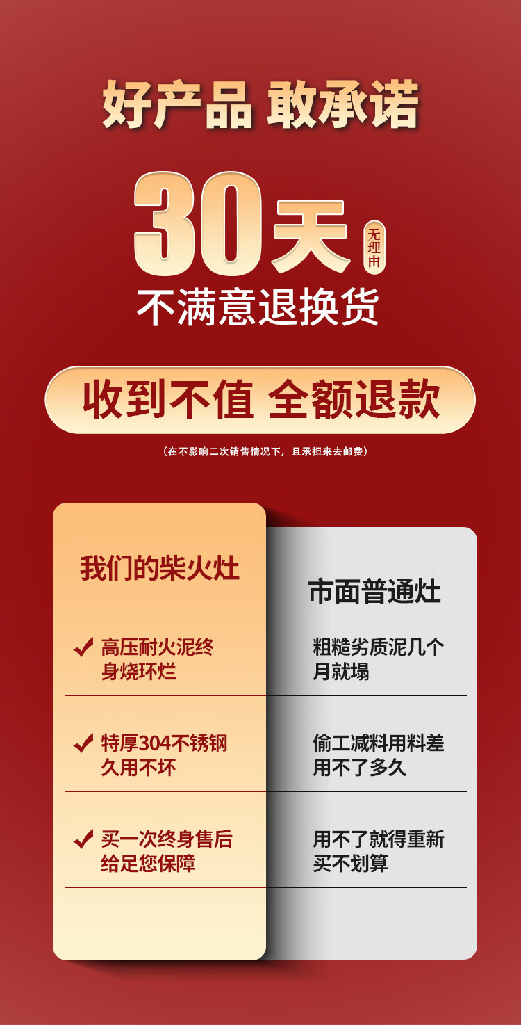 请大家不要买这个柴火灶,以免上当受骗,产品与商家描述不符,灶台上及周边烧点小火,水都不用烧开,温度就非常非常高,会烫伤人,并且平台不会维护消费者的权益。