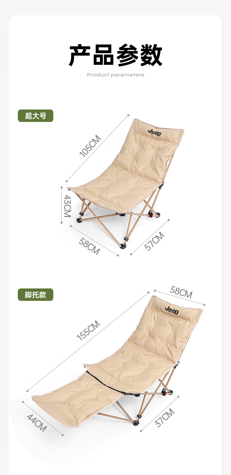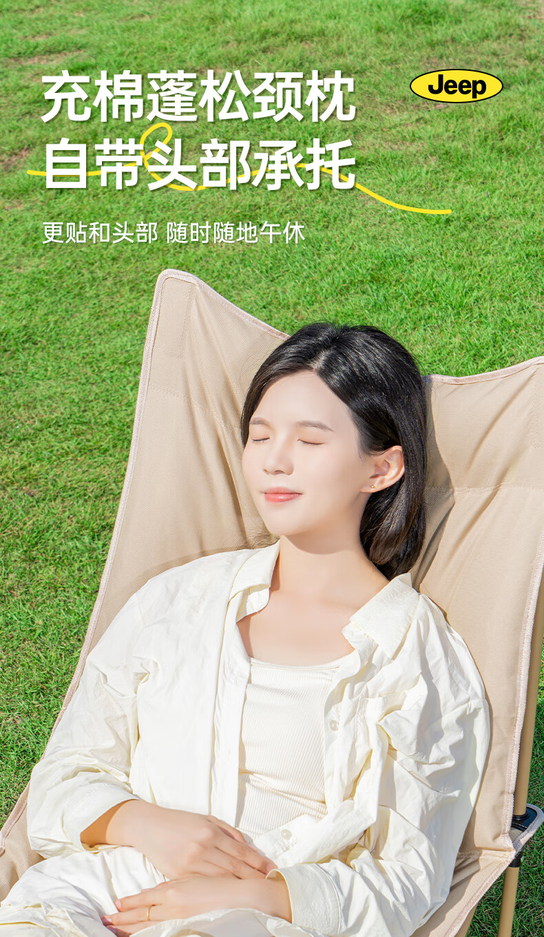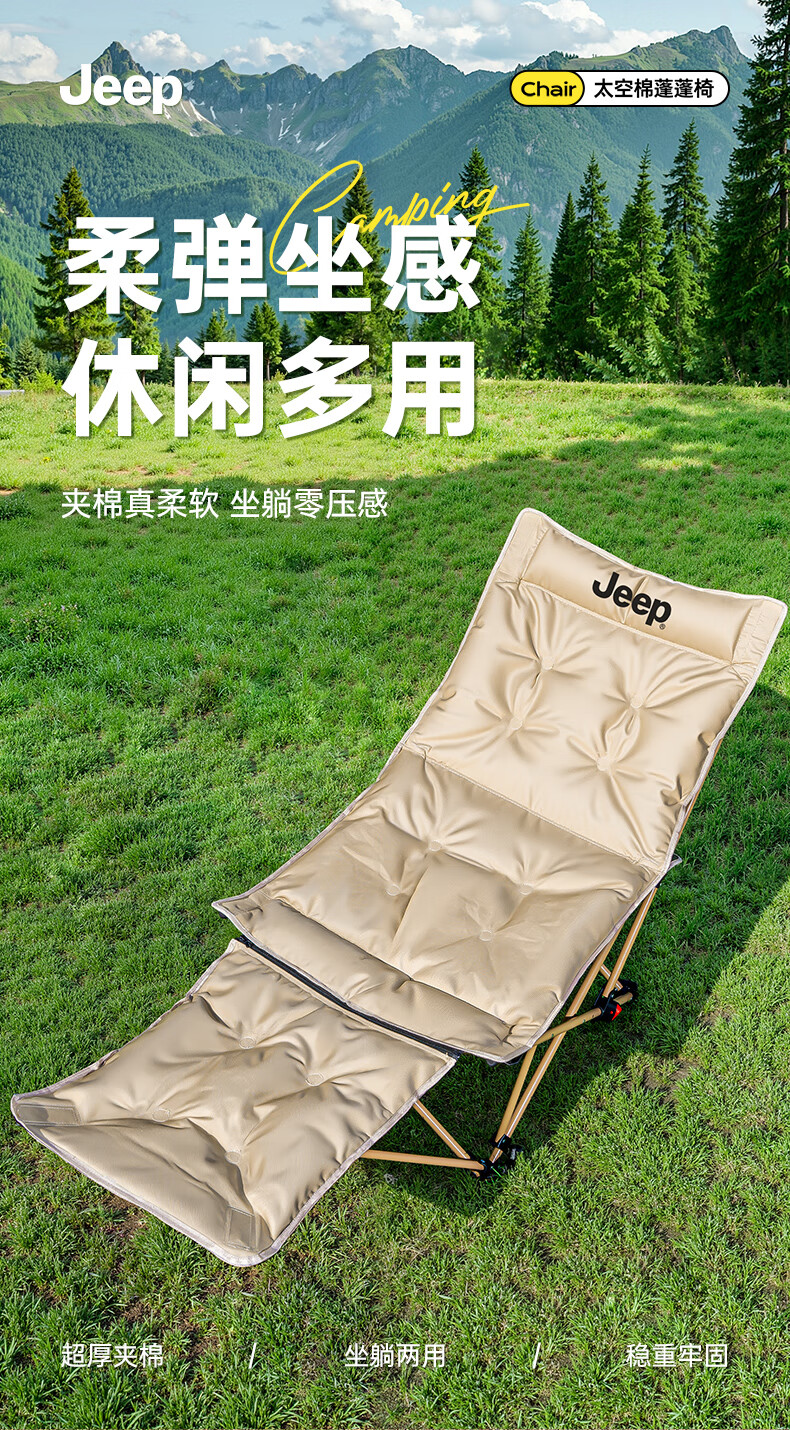 JEEP加棉懒人椅户外便携折叠椅子躺椅露营椅子新型月亮椅钓鱼沙滩椅 【全椅加棉/四档可调】超大号带脚托-曜石黑