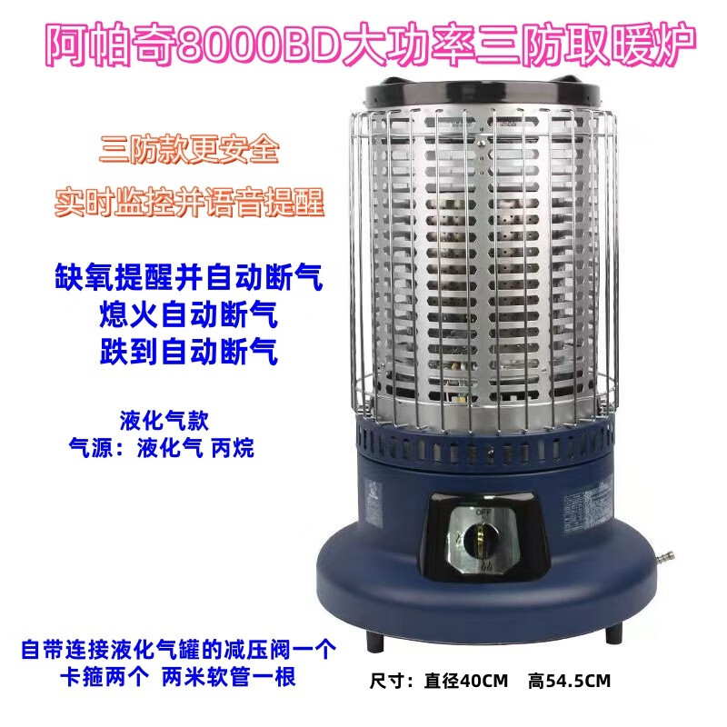 8000型适合比较大的空间取暖 北方零下二三十度时  棉帐篷七八平米至十几平平米适用  每 小时耗气量约五在六百克左右。