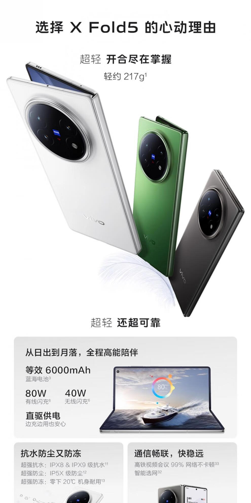 vivo X Fold5【国家补贴10%】等效6000mAh蓝海电池 超可靠三防折叠屏 蔡司超级长焦 AI 折叠屏手机 钛度 12GB+256GB
