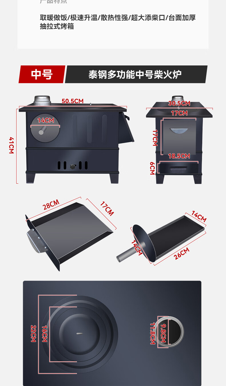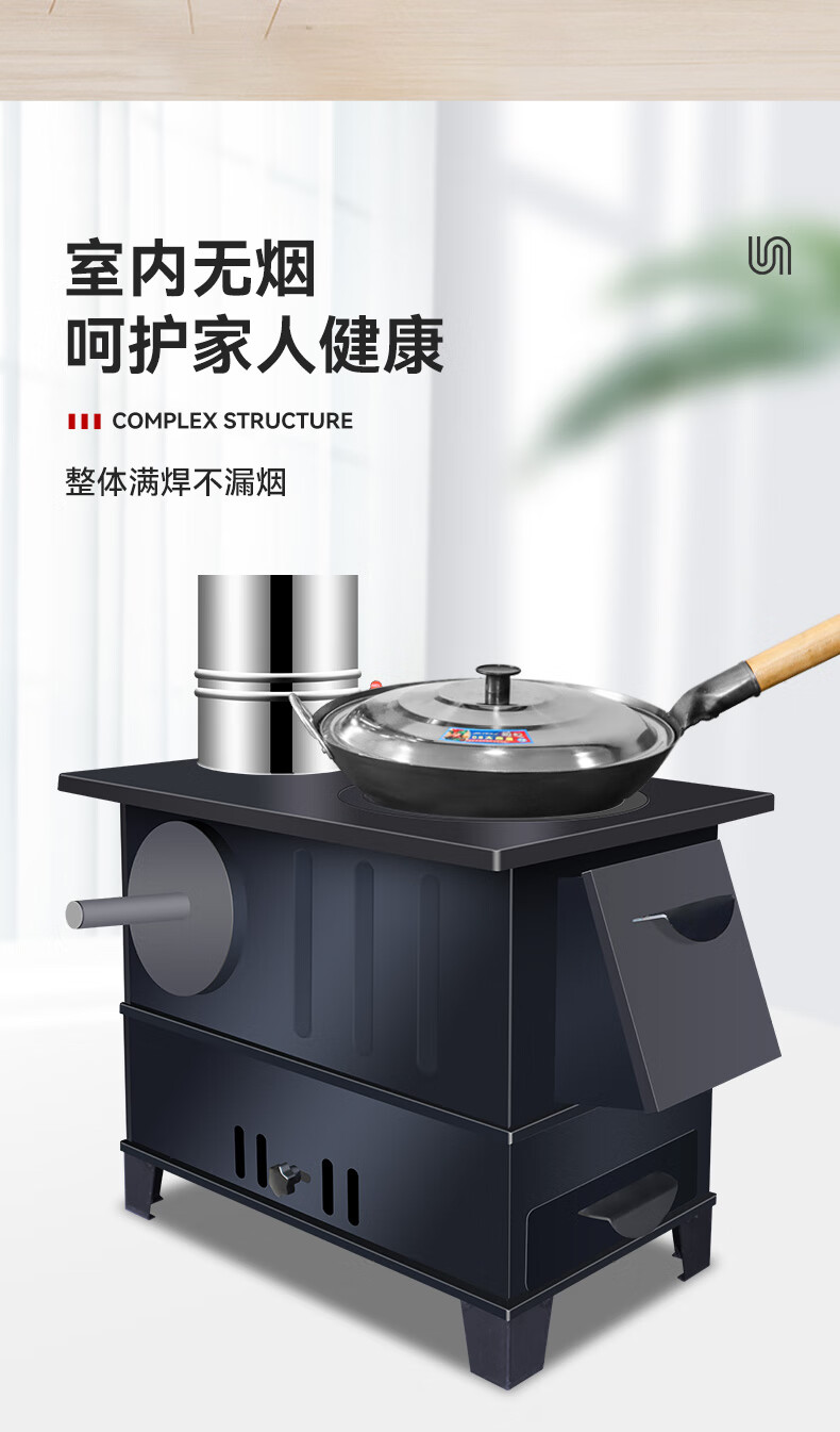 博朗晴新柴火灶烧木柴家用农村无烟室内取暖炉子移动铁锅台烤箱户外露营 中号泰钢+炉圈炉盖