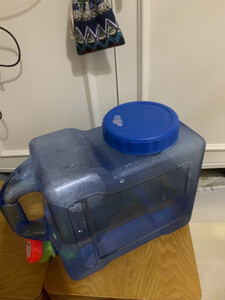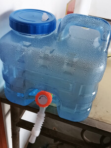 今收到带龙头水桶,桶做得很结实,就象外面送水的蓝色水桶一样,桶的材质较厚,做的结构也抗摔抗压,回来就洗了一下,装上水了,储存以防停水应急用。