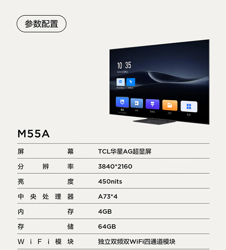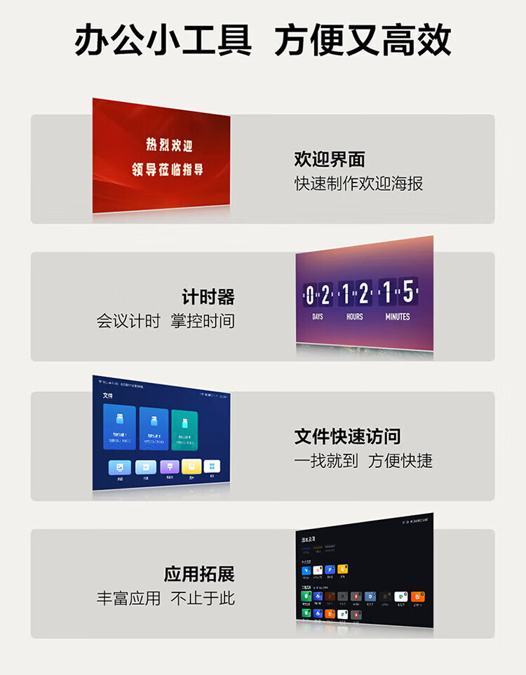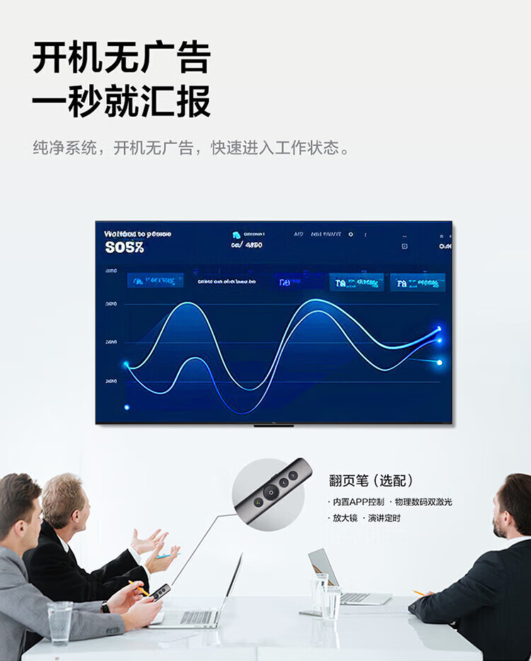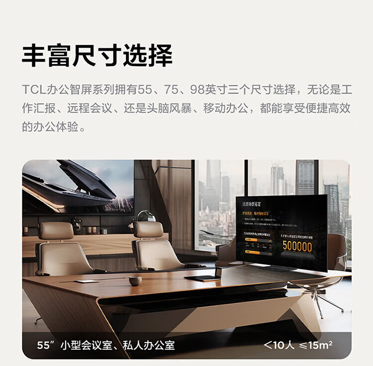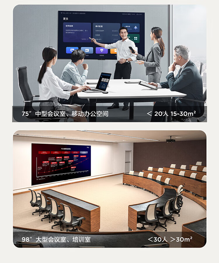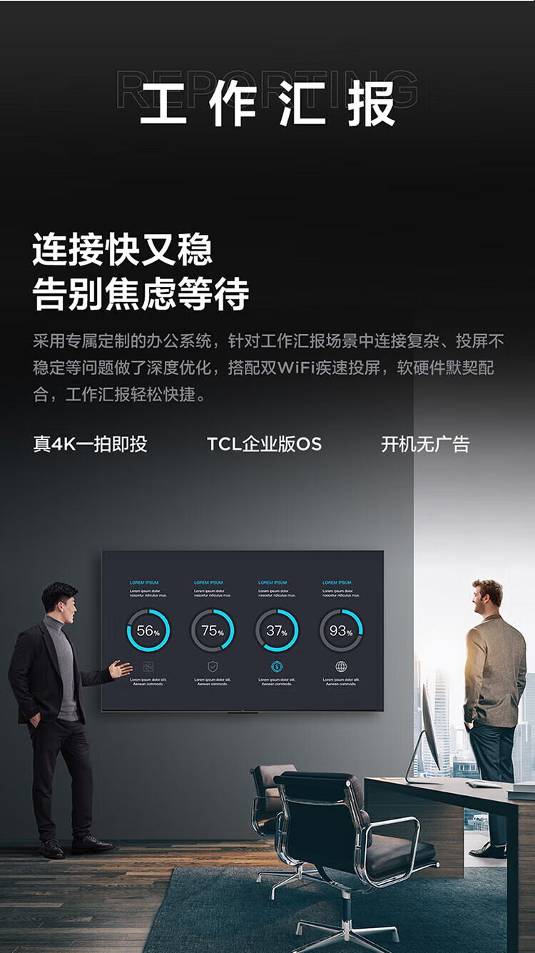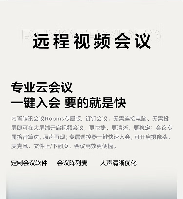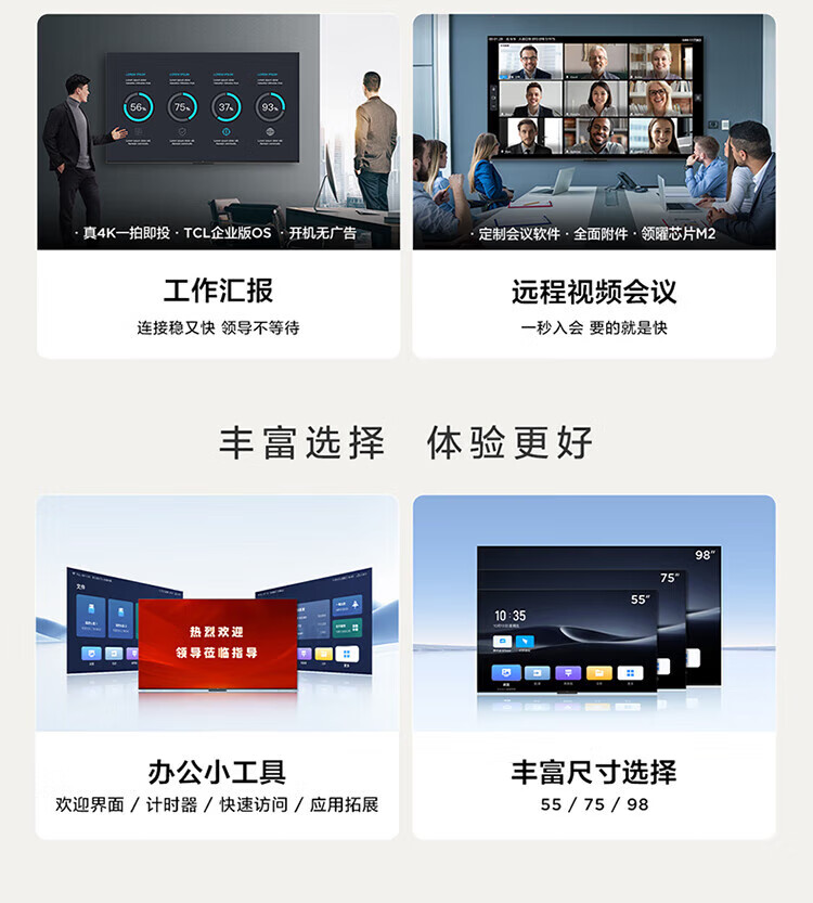 对比了三个品牌的会议电视,最终选择了TCL,京东的物流配送一直很快,第二天就收到了。电视安装好之后,开机很快,连接投屏也很快速方便