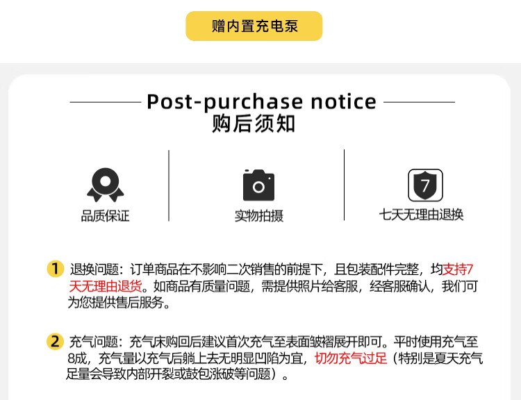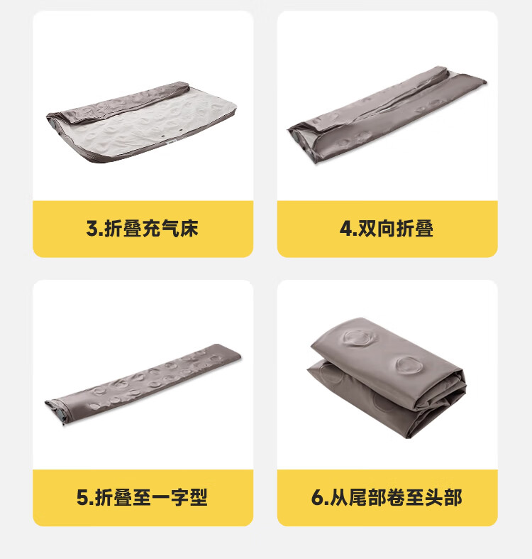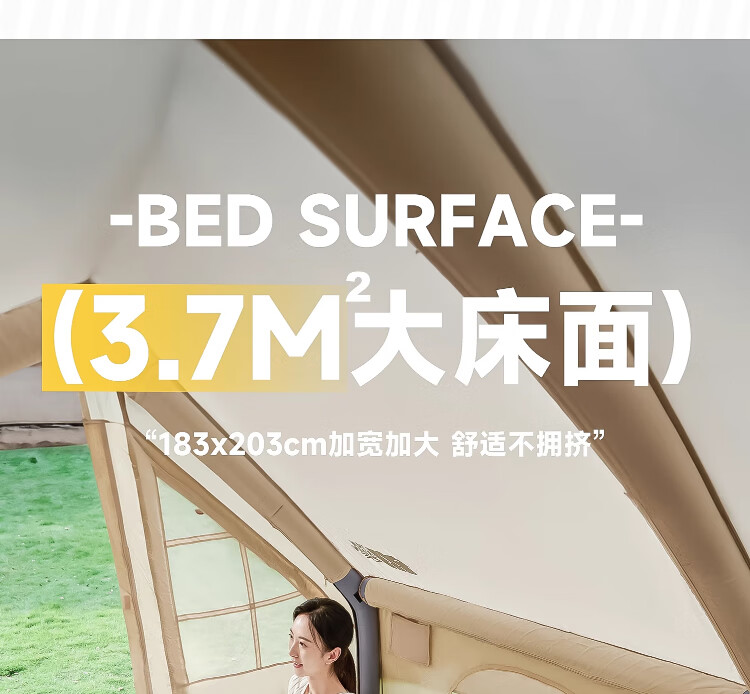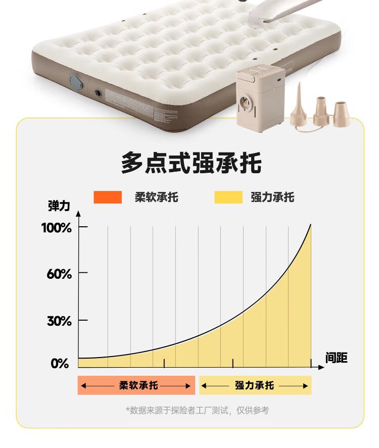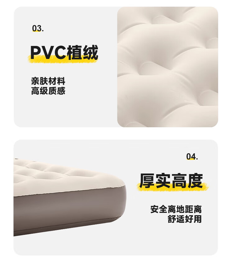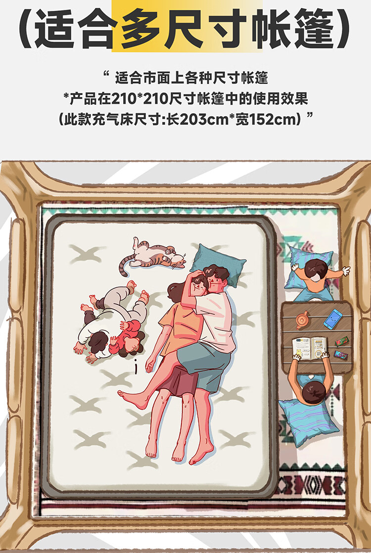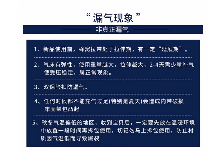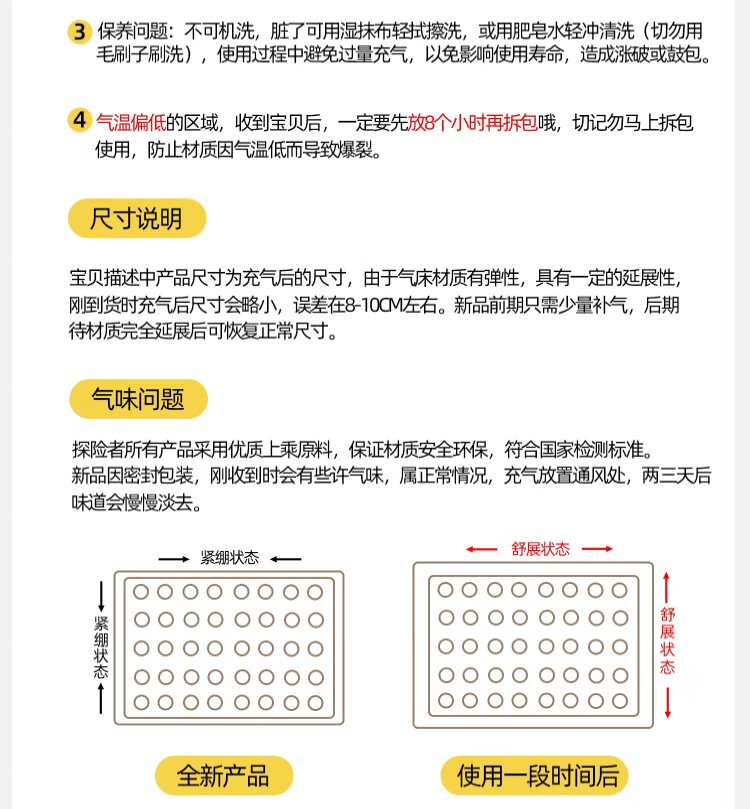 买的三人的,很宽大,充气后床面是小坑状的,需要配床笠或者厚床单使用才舒服点,用了四五次后开始慢漏气。