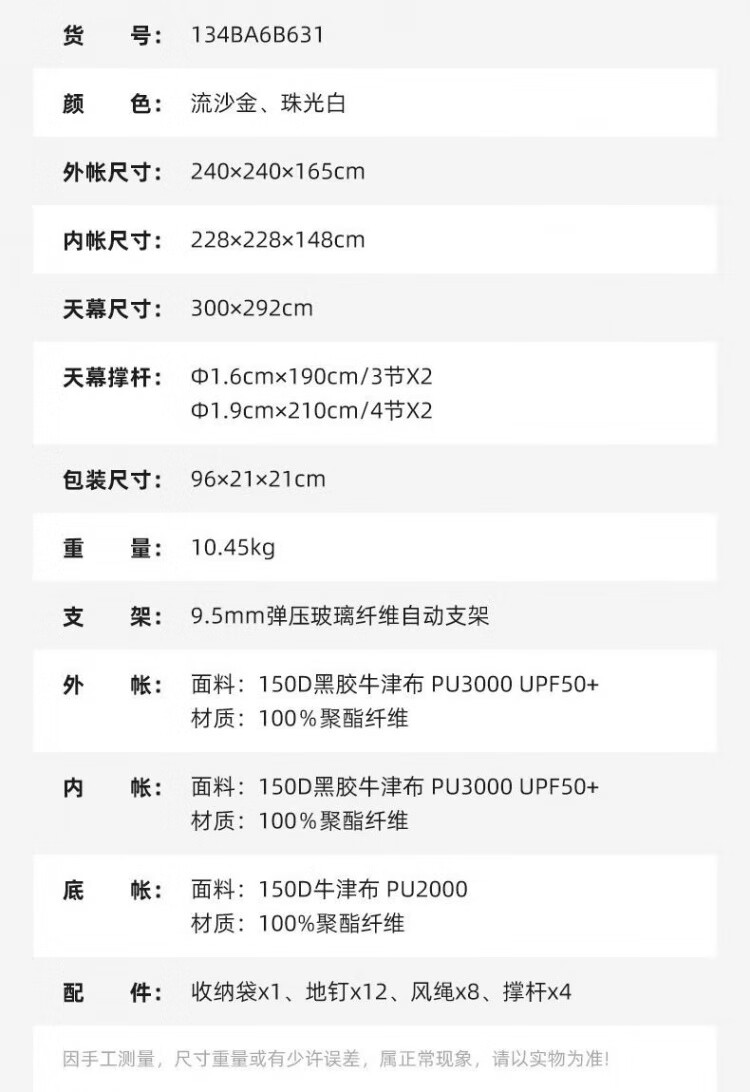 包装挺好挺精细,就是感觉内帐有点薄,说明说主要还是晴天使用的,所以买了个防潮垫又买了个充气垫,撑杆光有天幕的没有门厅的算是个小遗憾,没办法又单独买了两根撑杆