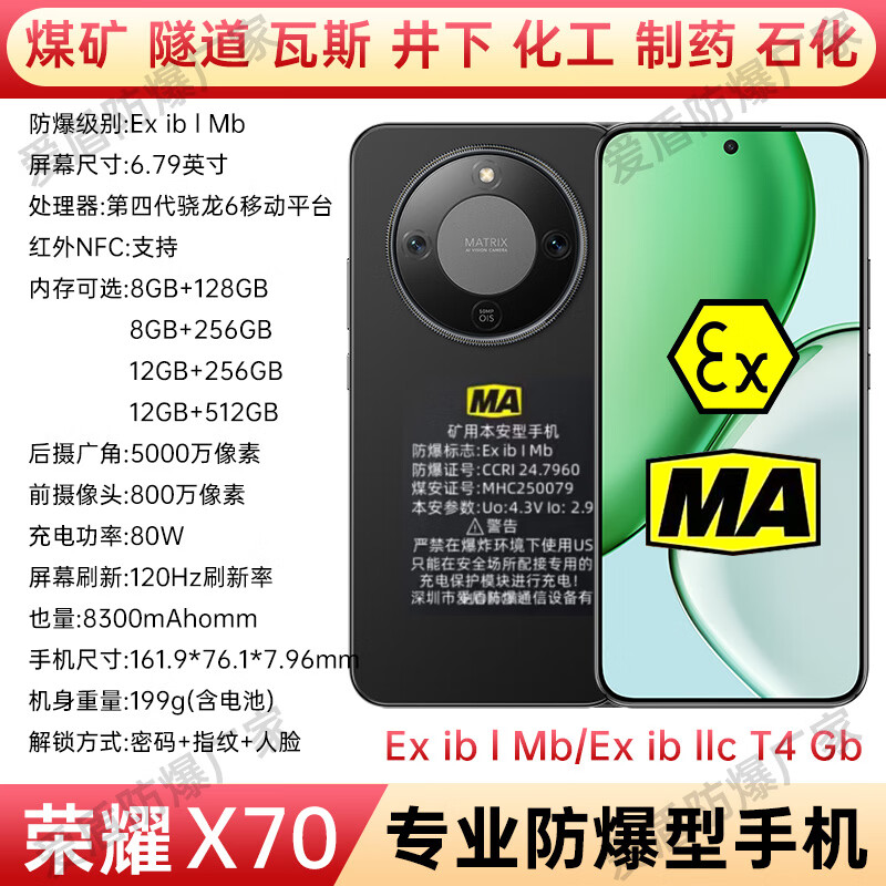 荣耀X70煤安防爆手机煤矿井下隧道瓦斯MA矿用防爆证书5G全网通EX工业化工厂石油天然气制药加油站巡检 X70【MA煤安 适用煤矿/井下/隧道/瓦斯】 8GB+128GB