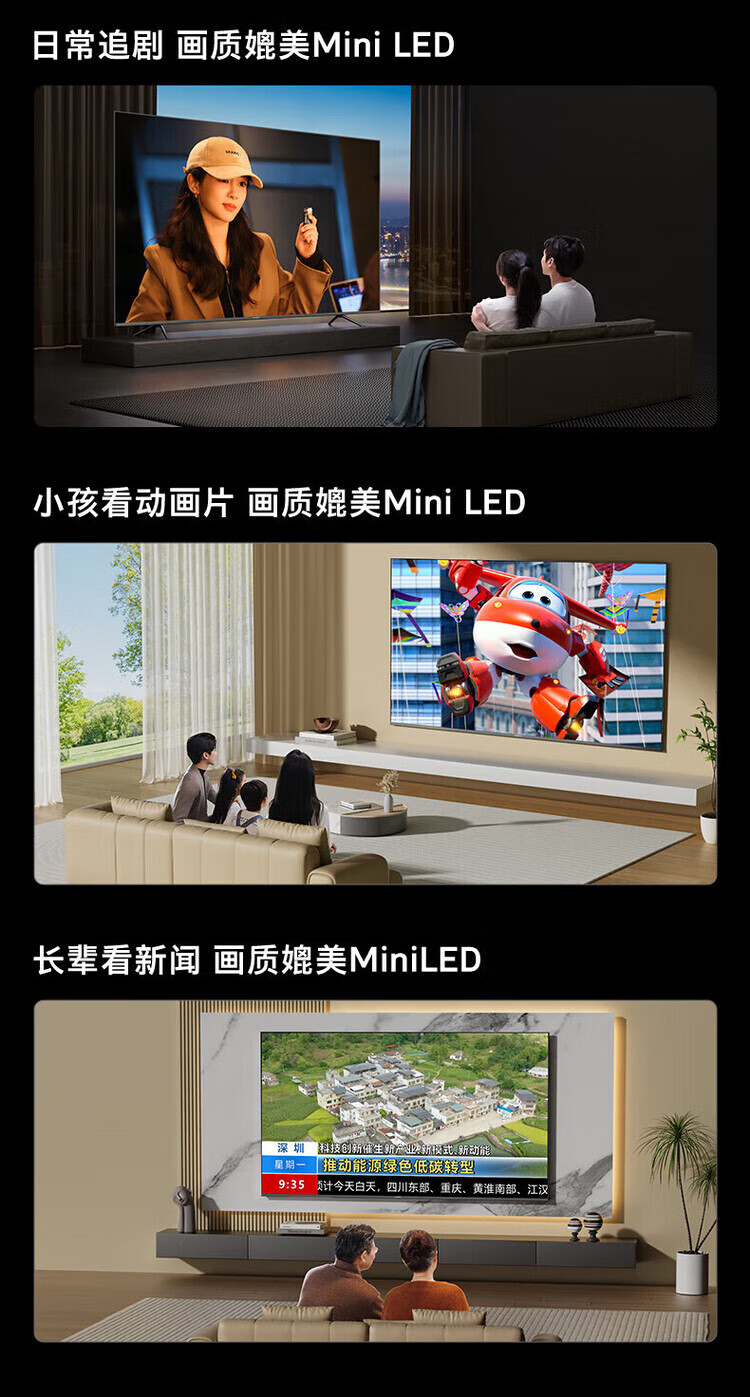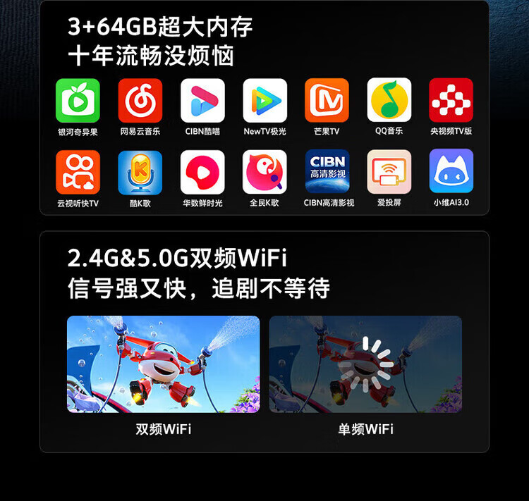 电视机大小刚刚好, 外形外观:很好看,很喜欢,很不错,下次会推荐朋友再来买 运行速度:很快,很快很快 屏幕音效:一下也不错,屏幕大小尺寸都刚刚好,还会再来买了,看起来效果很不错,很喜欢呢
