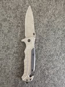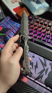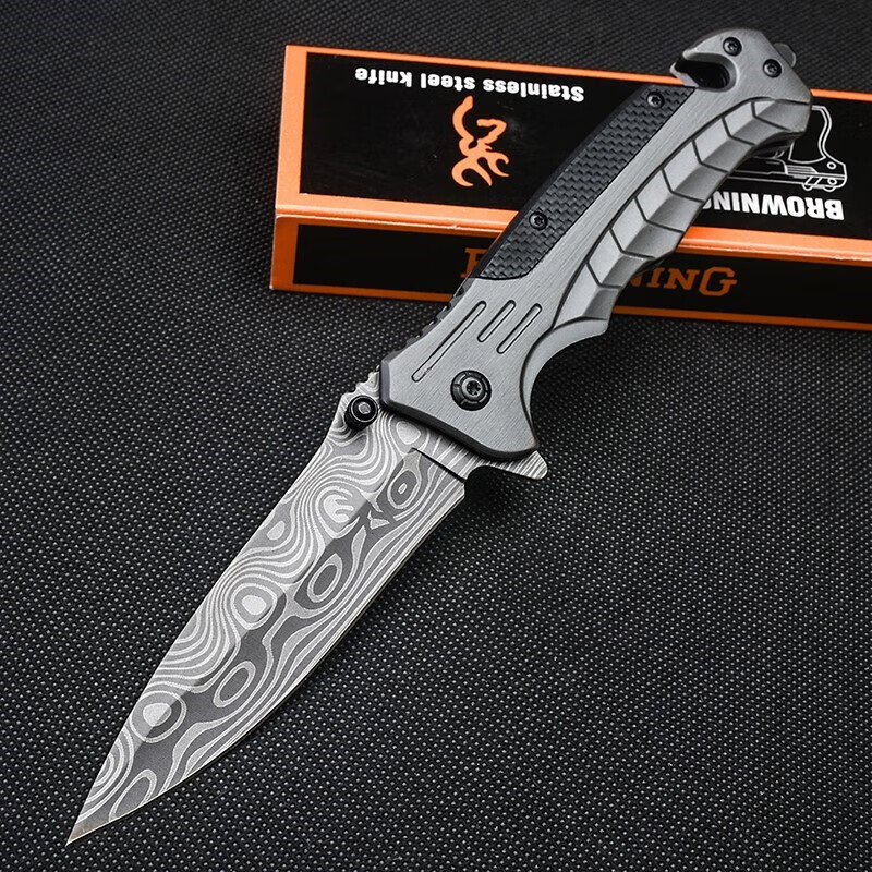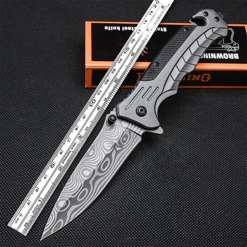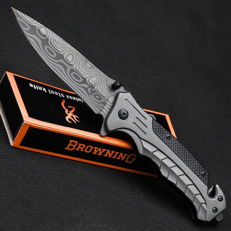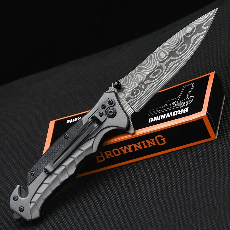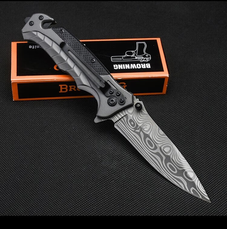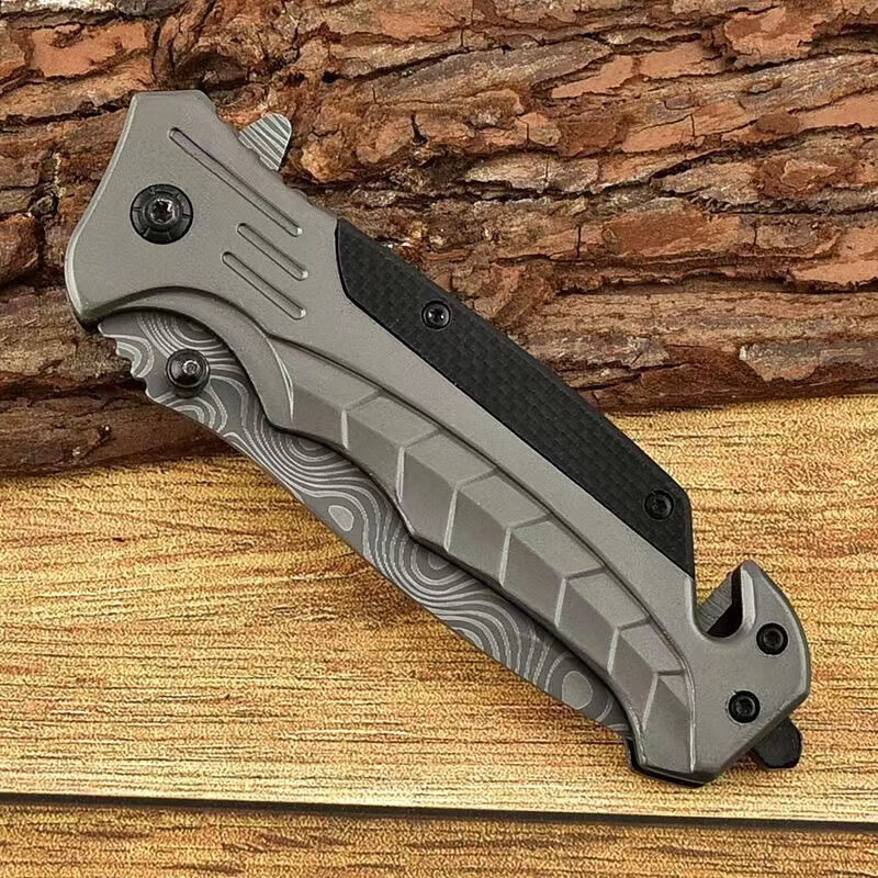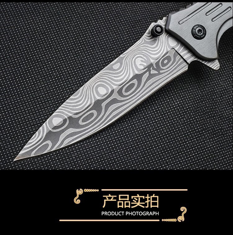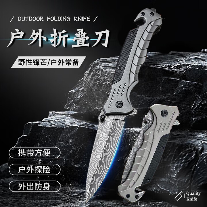 这把灰色折叠刀太实用了!大马士革纹路超有质感,9cm闭合长度放口袋毫无压力。开快递、切水果超顺手,60°以上硬度够扎实,烧烤时处理食材也稳。展开12cm刀刃长度适中,多功能设计很贴心。锁扣紧实不晃,收合顺畅,性价比很高,日常携带防身或户外用都合适,推荐入手!