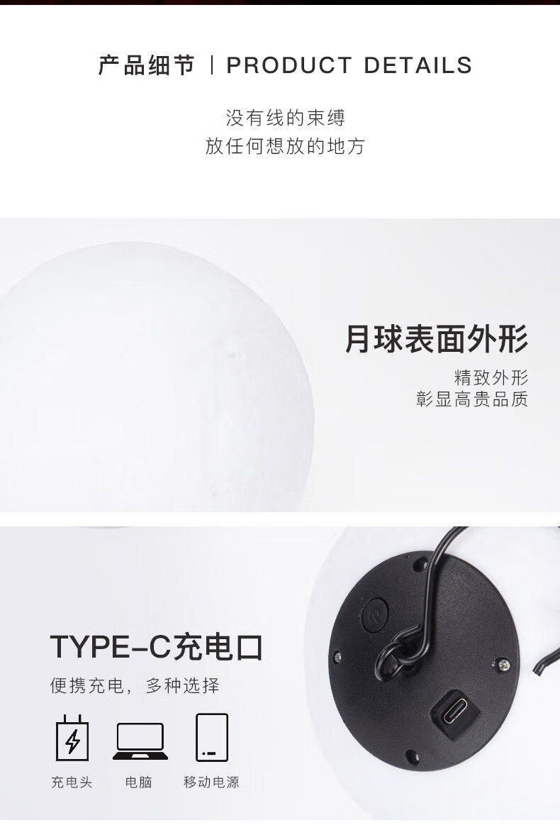 月球灯超级有氛围感,放在房间角落里很好看~~太喜欢这款灯啦,拍照超级好看!!usb充电很方便,三色调光很不错,质量很好喜欢!!