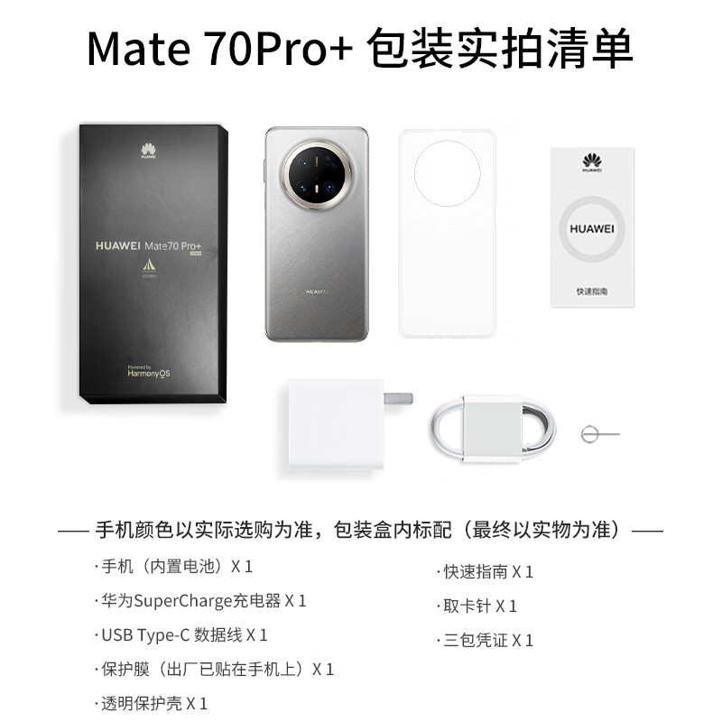 手机(内置电池) x 1 华为充电器 X 1 数据线 X 1 透明保护壳 x 1 快速指南 x 1 取卡针 x 1 保护膜(出厂贴在手机上) X 1 三包凭证 x 1 会员权益礼包 x 1