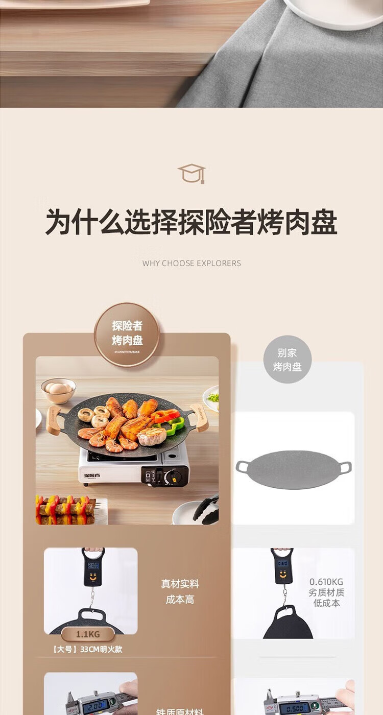 探险者的这个户外烤肉烤盘非常不错,搭配的探险者的这个炉子使用蛮不错的,也不会晃动非常防滑,做的非常好然后也不会粘锅这个烤盘的厚度比一般的品牌会厚一点,然后还赠送了这个把手