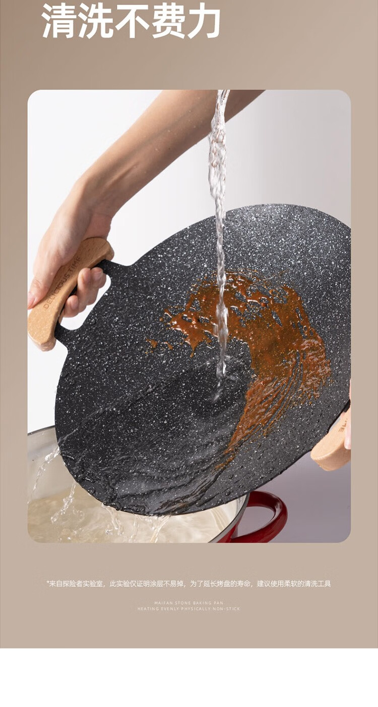 真的不粘,第1次使用就得到了朋友的好评,它的受热均匀,上面的污渍用。厨房用纸巾一擦就掉了,完全可以在户外,不用水就可以洗干净。也完全不粘锅,受热均匀。