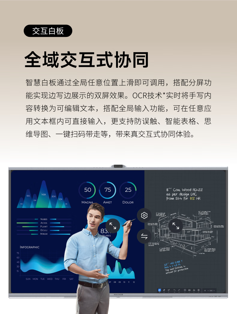 自带win10系统,能当黑板用,还能通过传屏器直接投影,功能太齐全了,老板非常满意,该有的功能都有,高端大气上档次的不二之选。