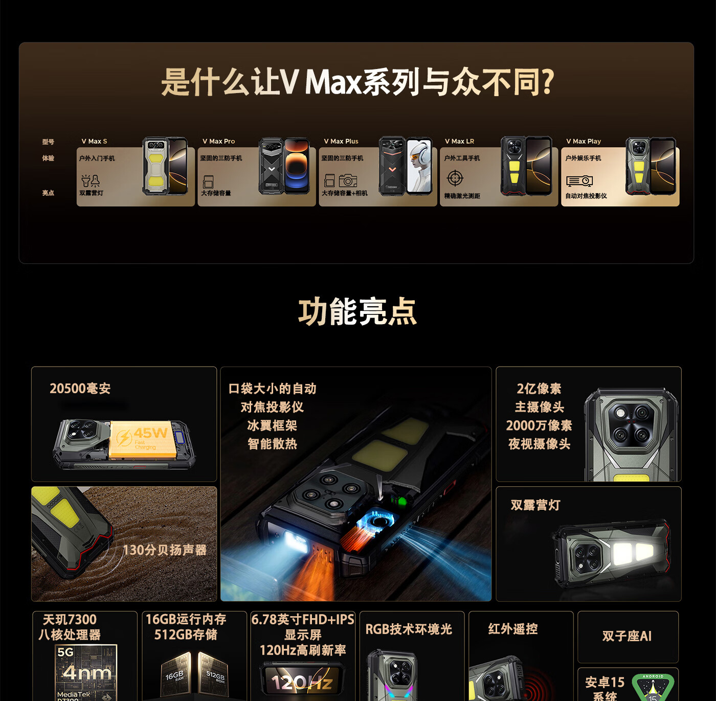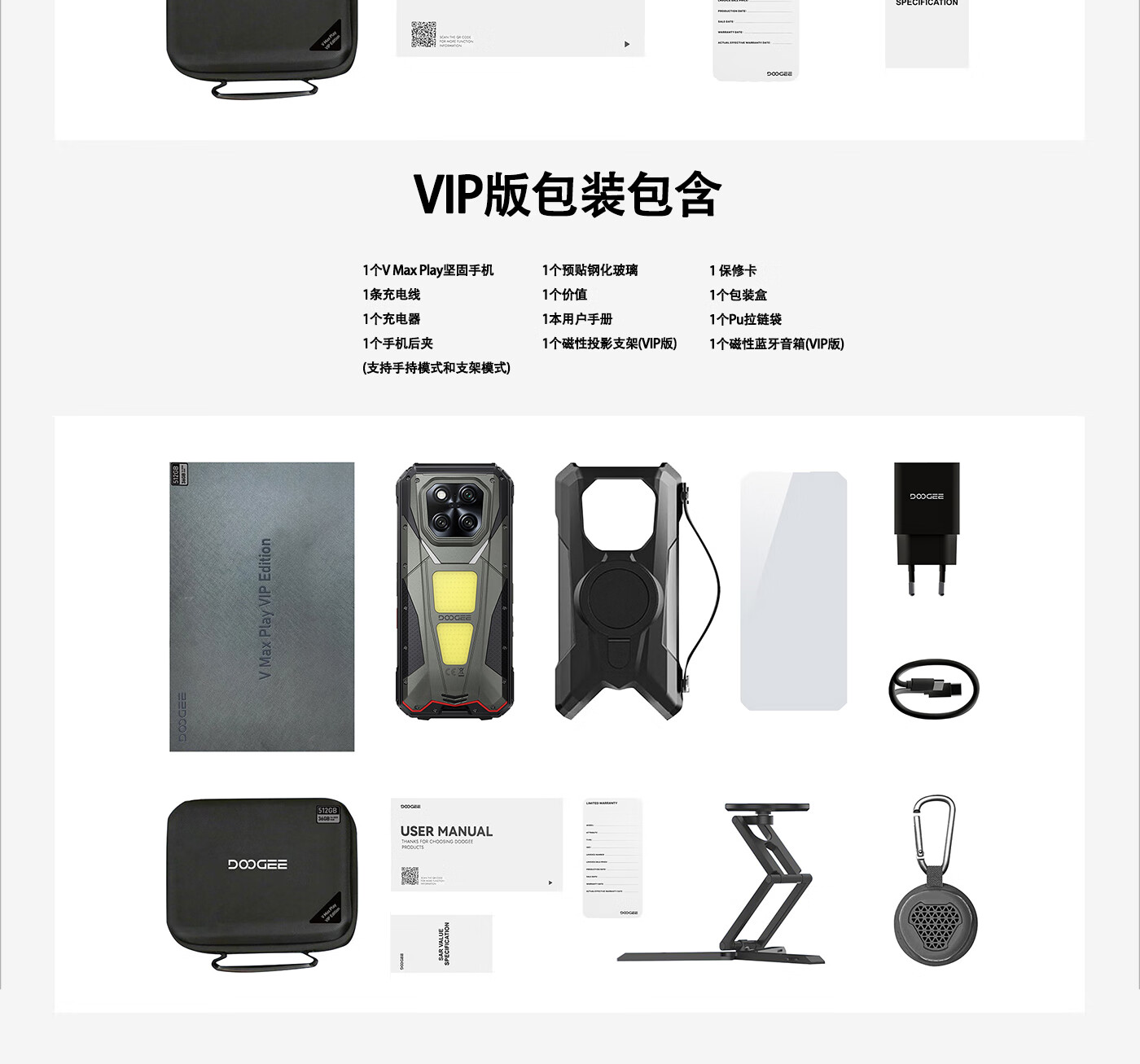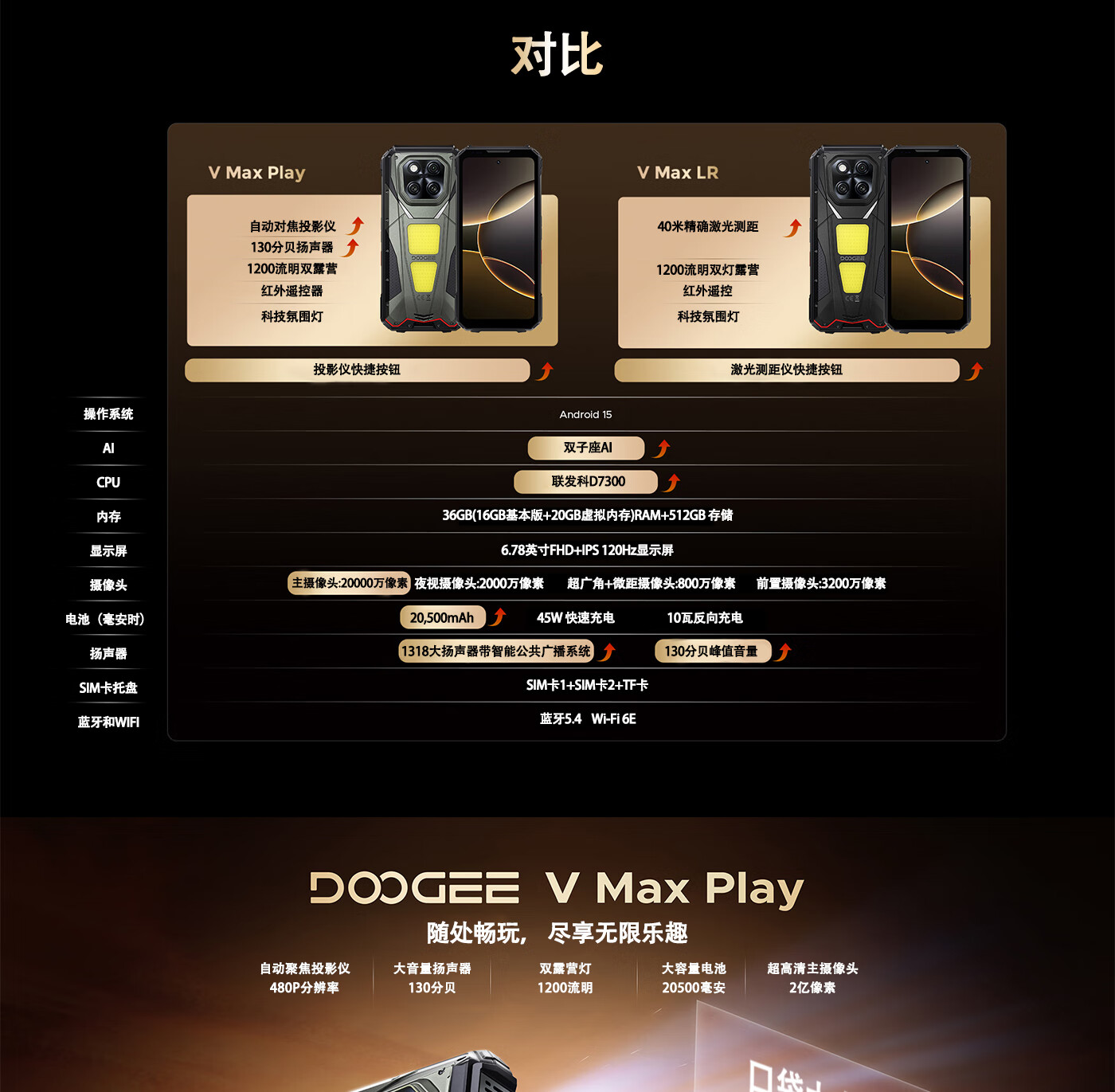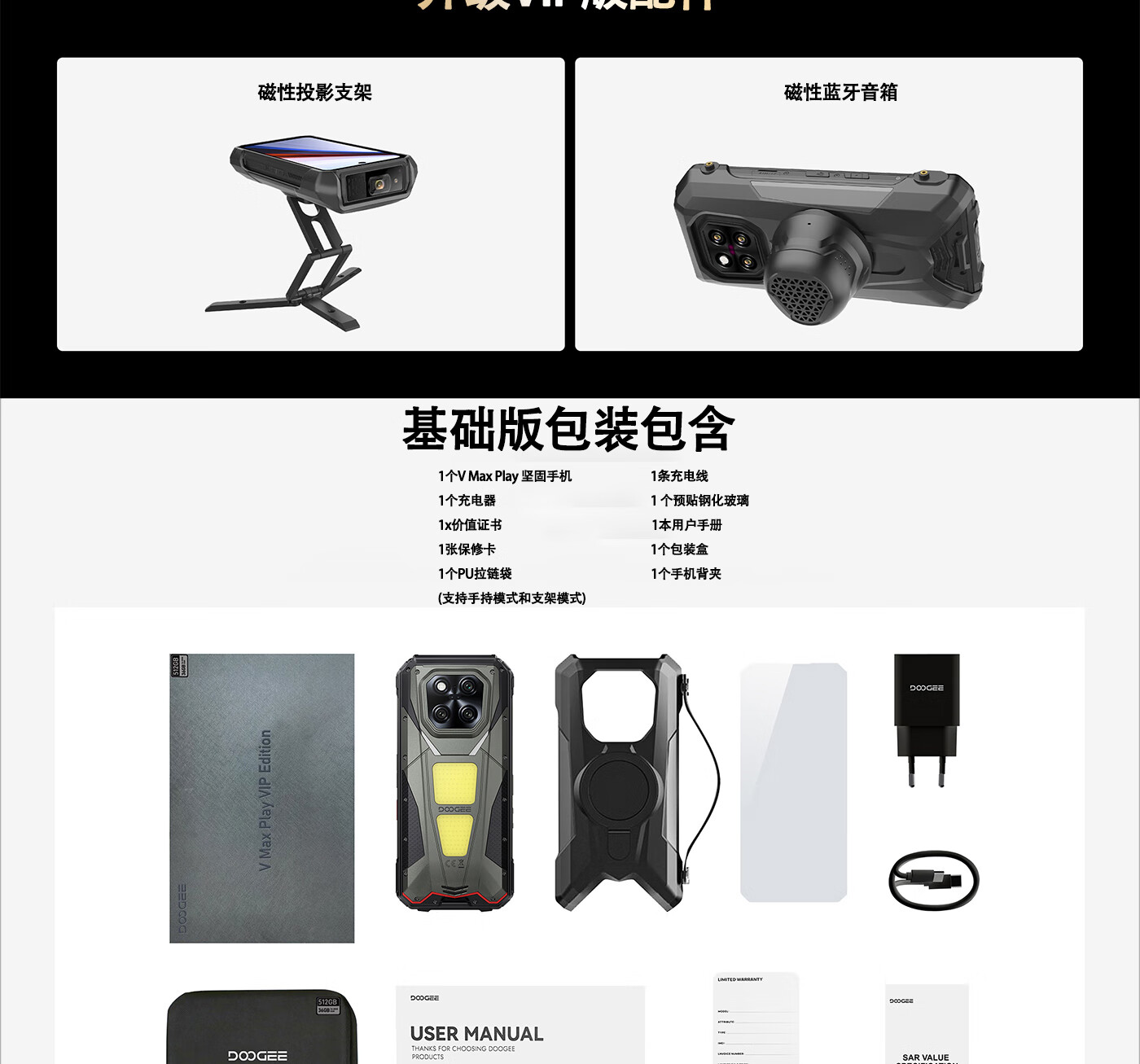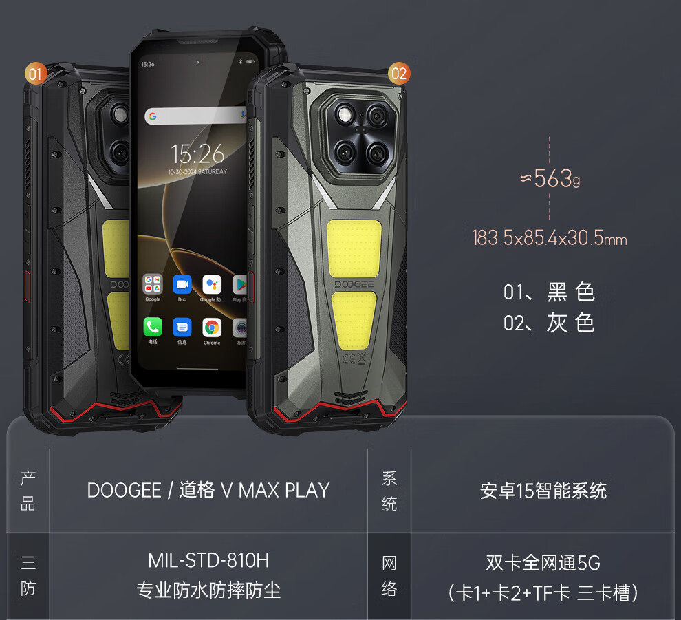 DOOGEE道格新款 VMaxPlay5G三防智能户外手机红外遥控LED投影480P自动对焦双露营灯20500mAh大电池长续航 V Max Play 黑色(36G+512G)