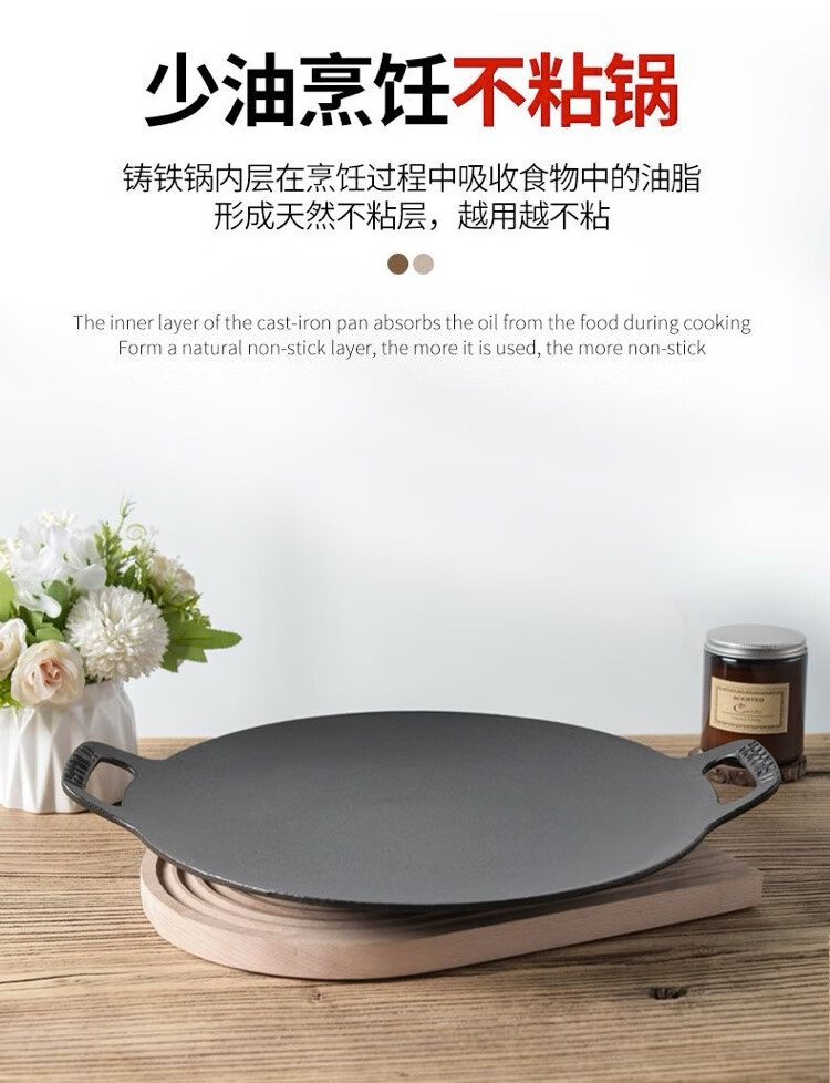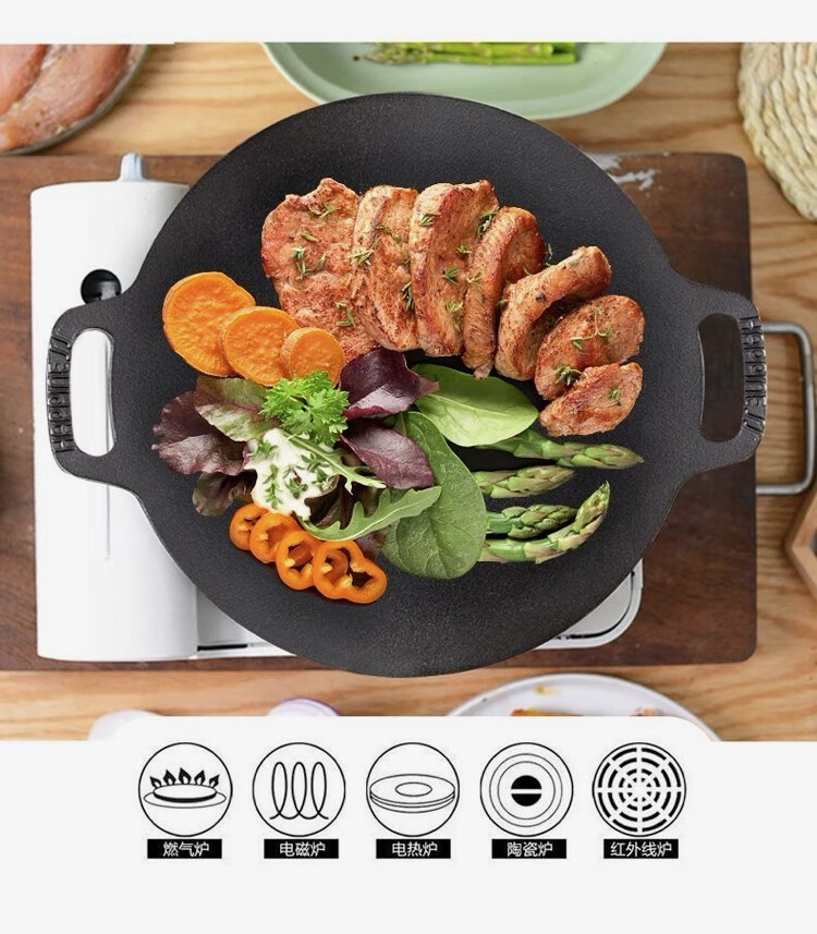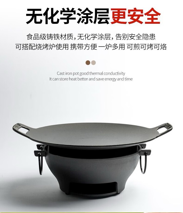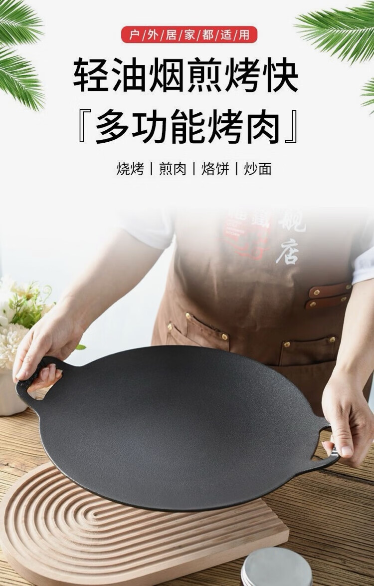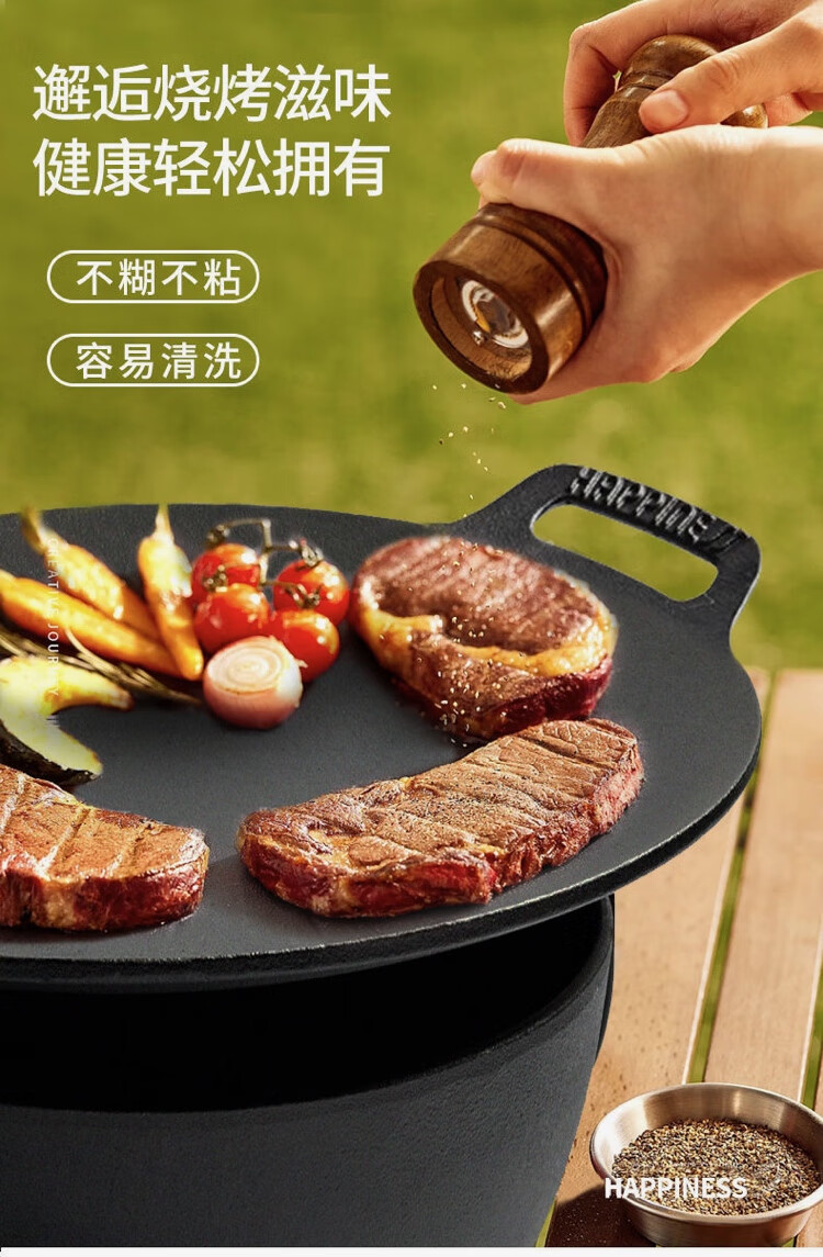 户外铸铁烤炉烧烤炉烧烤肉圆形煮茶露营木炭无涂层加厚 40cm螺纹烤盘+烤肉夹+麻绳+油刷