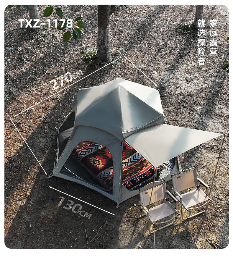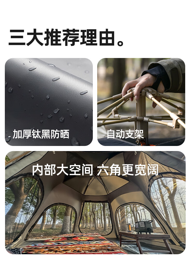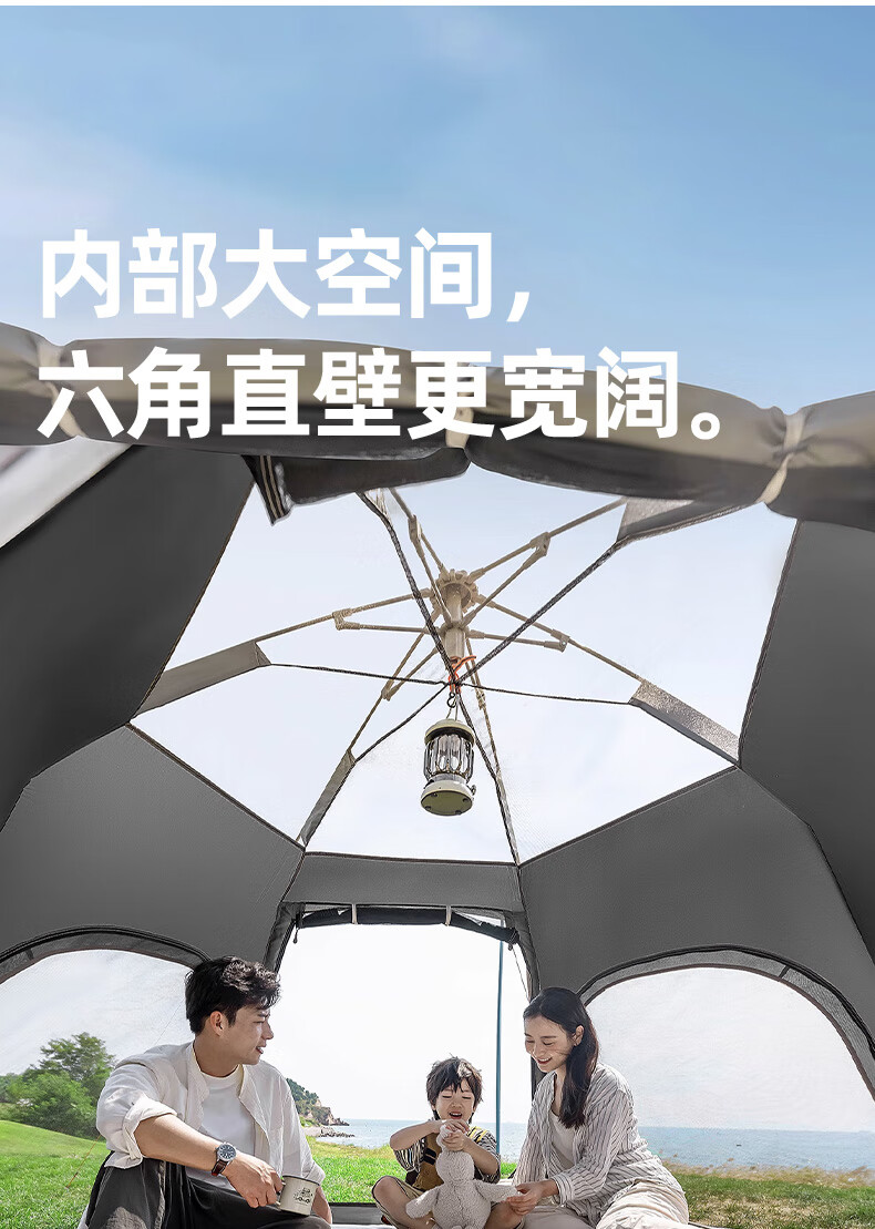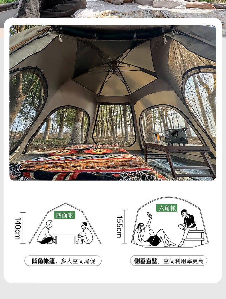 帐篷使用很方便,一压就安装好了,刚好买了出去露营,空间很大,1.8的床可以睡4个人。质量很好的哦,空间六角型够大,对的之前买的长方型好多了。;六角的稳定性更高。更宽敞。拉链丝滑,不透光;更防晒。