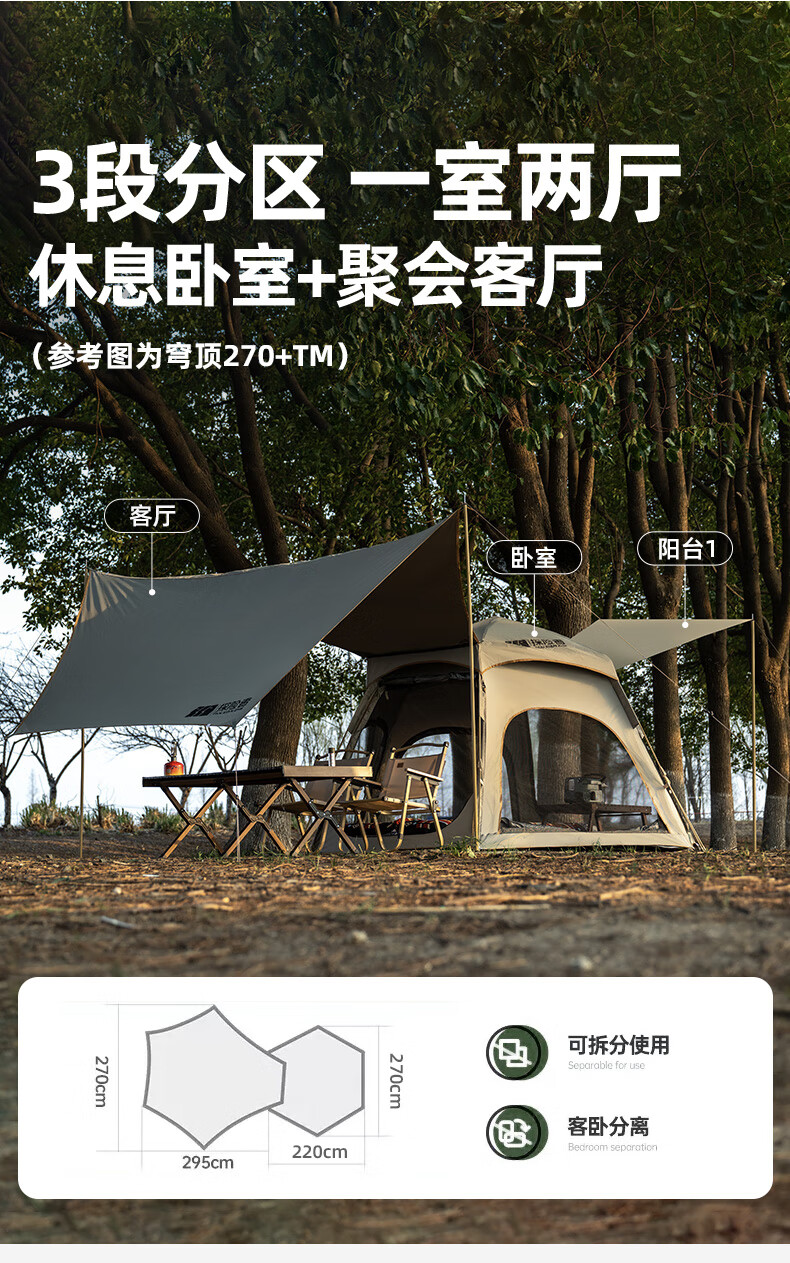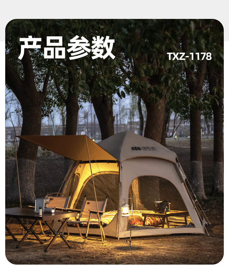 商品品质:为了这次露营,特意挑选了这款帐篷,果然没让我失望。帐篷的外观简约大方,颜值很高。材质不仅防水,还防晒,在太阳下暴晒了一整天,里面温度也没有很高。搭建过程很顺利,即使是新手也能轻松上手。内部空间设计合理,有多个隔层和口袋,可以分类存放物品,非常实用。这次露营体验因为有了它变得更加完美!