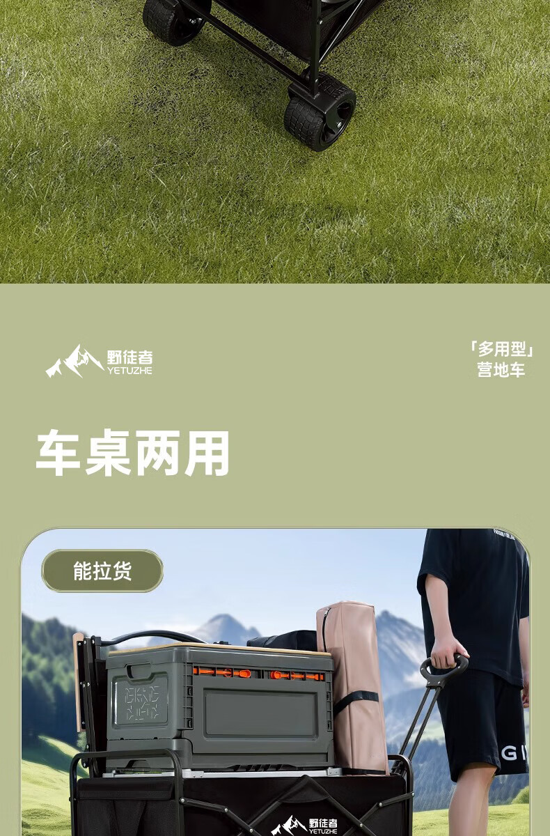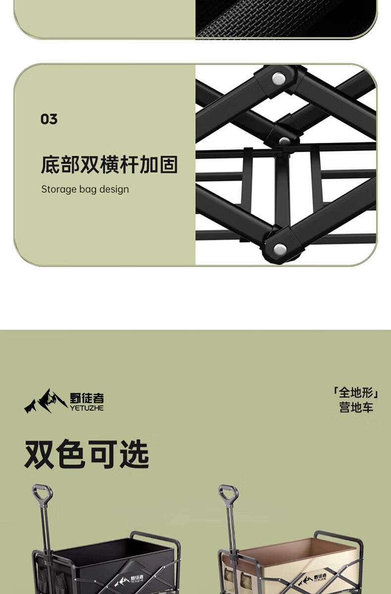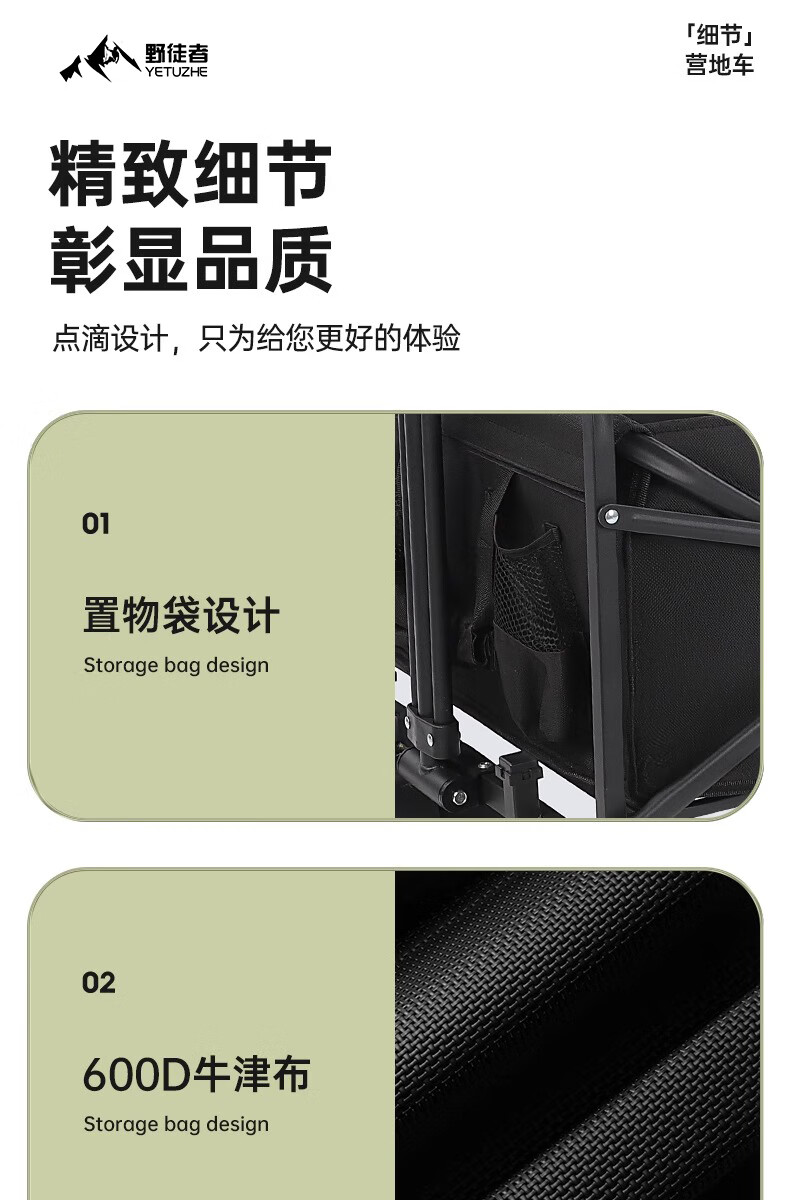 露营车质量很好很结实,材质也很坚固,比较有质感,容量也很不错,春秋露营优选,这款露营车简直就是户外爱好者的福音!精选优质耐磨材质,结构稳固承重力强,细腻质感彰显品质,超大容量轻松收纳装备,无论是春日踏青还是秋日野营,都是您不可或缺的贴心伙伴,让每一次出行都更加轻松愉悦。