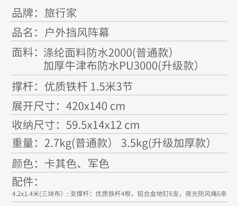 旅行家阵幕户外露营挡风板防风屏风野餐野炊篝火折叠便携围帐围布围墙 军色(加厚可拼接款)