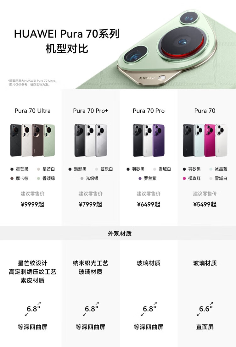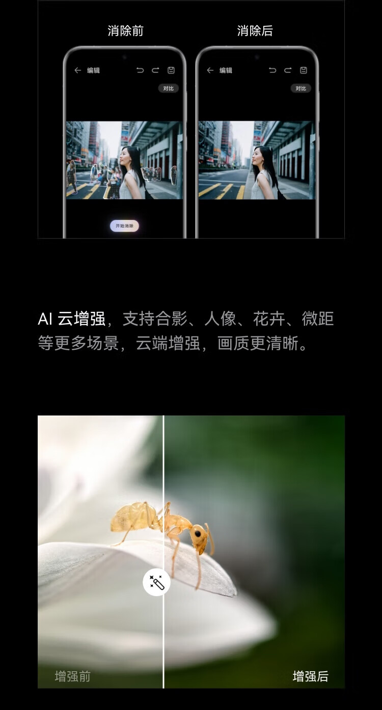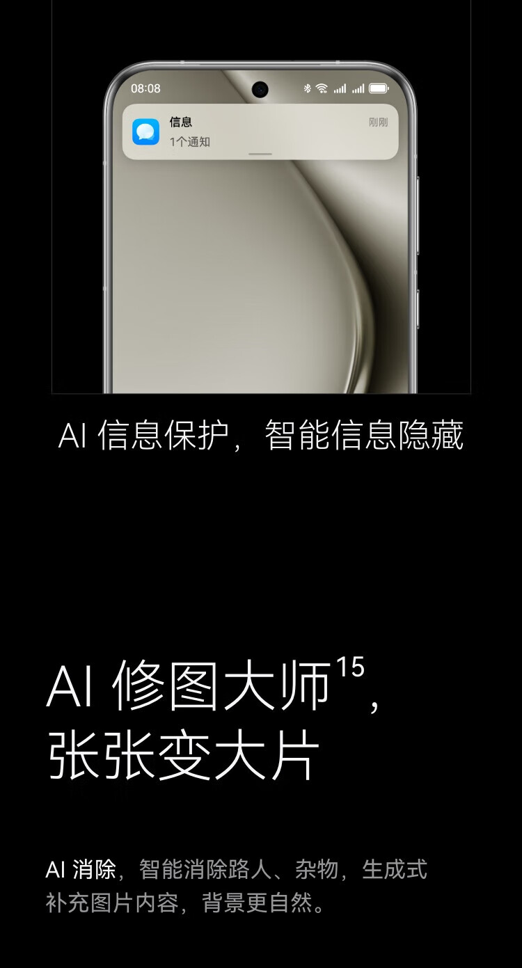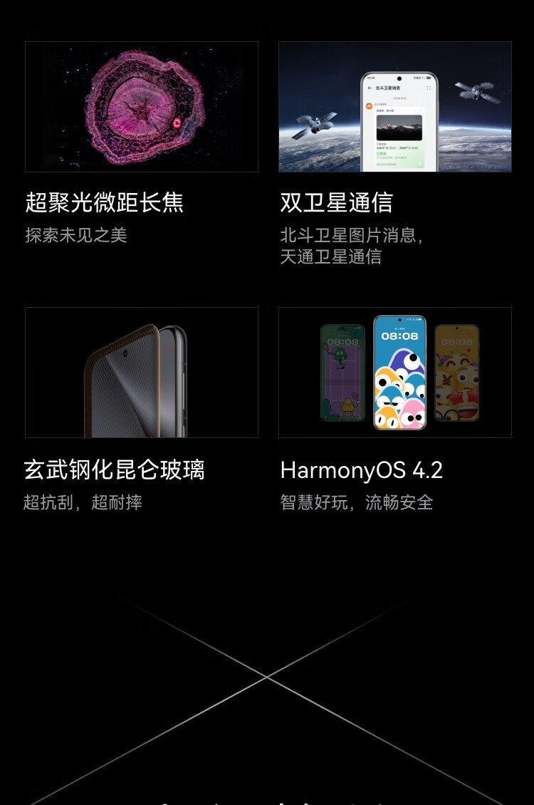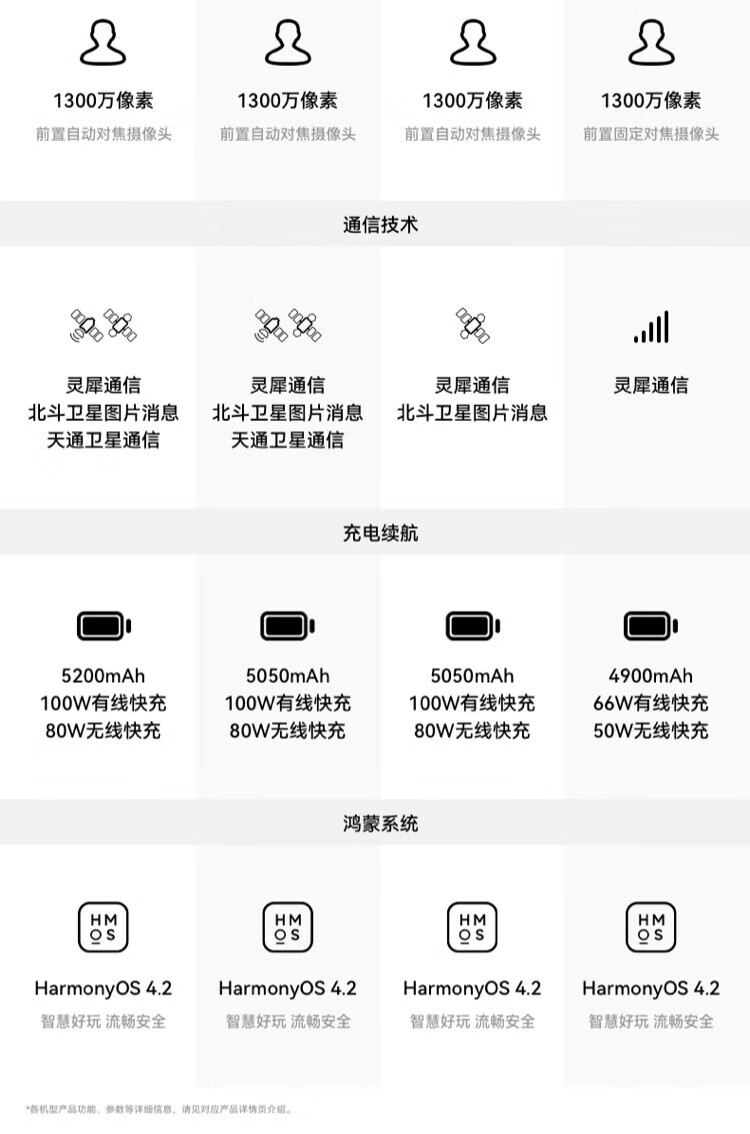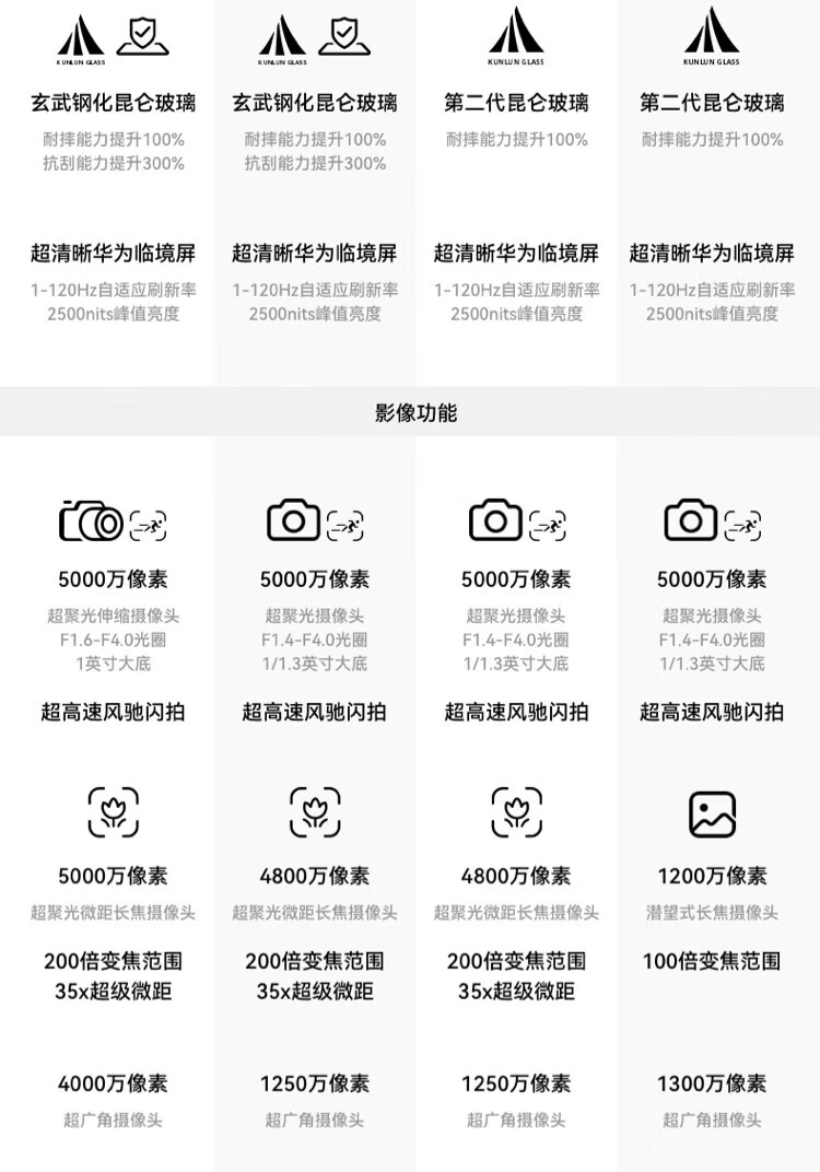 AI大模型,卫星通话,LTPO屏幕,高频PWM调光,全焦段影像,潜望式长焦,防水防尘,无线充电,NFC,红外遥控,大底主摄,等深微曲屏