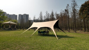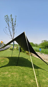 快递很快,特意等使用完了之后才来评价的,这个天幕搭起来很方便,铺开在地上后,钉钉子,撑起撑杆,熟练以后不到十分钟就可以搭起来了。遮阳效果明显,也很结实,。