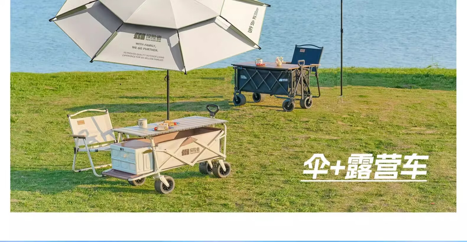 北山狼户外露营车聚拢大号营地车旅行野餐野营可推儿童遛娃手推车 海蓝色【推杆款】+黑色桌板