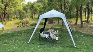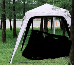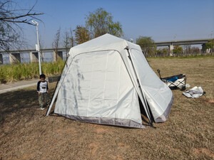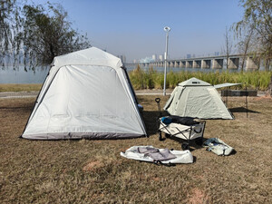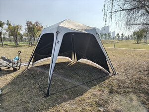 几分钟就搭好天幕。质量也非常好。性价比高。草地上搭起来就敲了四角的地钉。非常的方便,刮风也很稳的。空间大不压顶不局促。走进走出不用低头。