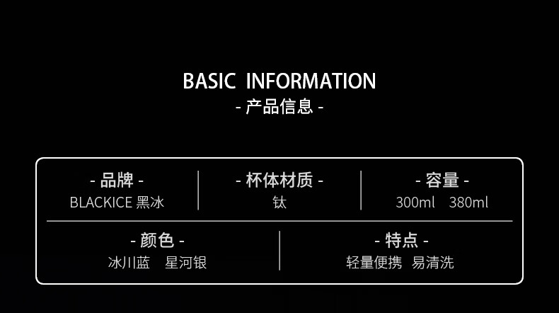 黑冰的产品看着挺专业的,这款钛杯的性价比很高,综合对比了几款最后选了这个,冰川蓝配色很好看
