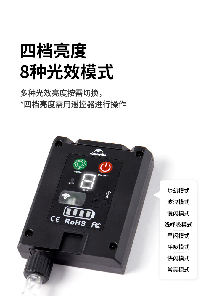 灯的亮度可以,晚上灯亮起来氛围感超级好,很多种灯光模式,省去了充电的麻烦