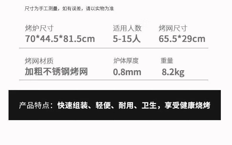物流很快,👍产品很快就收到了,比想象中还好,不错不错!希望能耐用 有个小磕碰 不影响使用 看着还可以 有蛮大 烧烤等过年的时候再搞 搞完之后 使用后再来追评 这么大的烤炉 一家人吃的都够了 希望不会失望