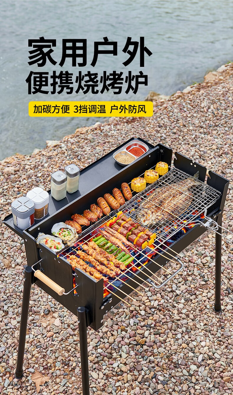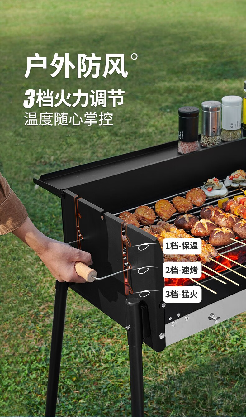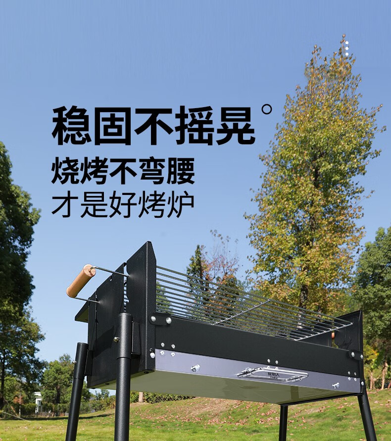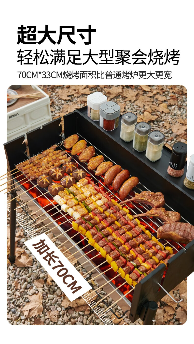 便携性能:折叠起来很方便,也不占空间 炭火烧烤也非常集中,非常耐烧,炉子竹签都不会烧到,烤串也非常快 用料材质:炉子很厚实尤其是烤架挺粗的不锈钢 套餐带的一系列东西非常多,啥都不缺了,尤其是烤鱼夹超级好用,烤鸡翅豆腐啥的都可以