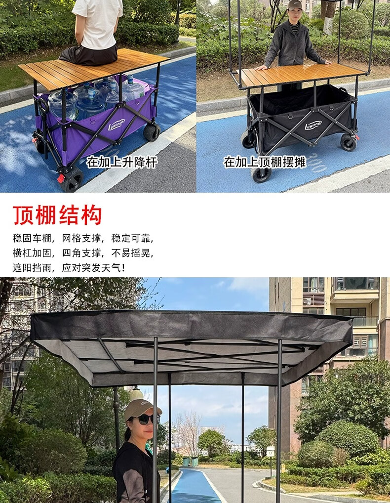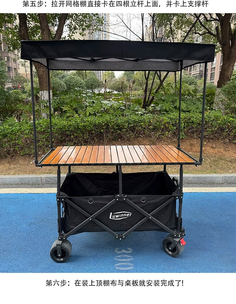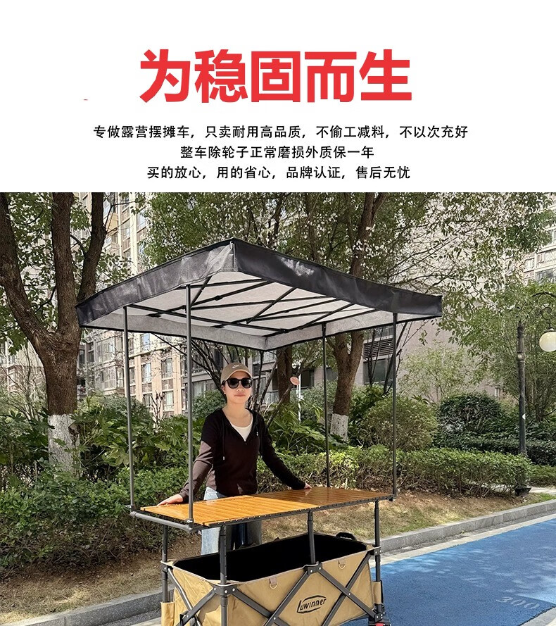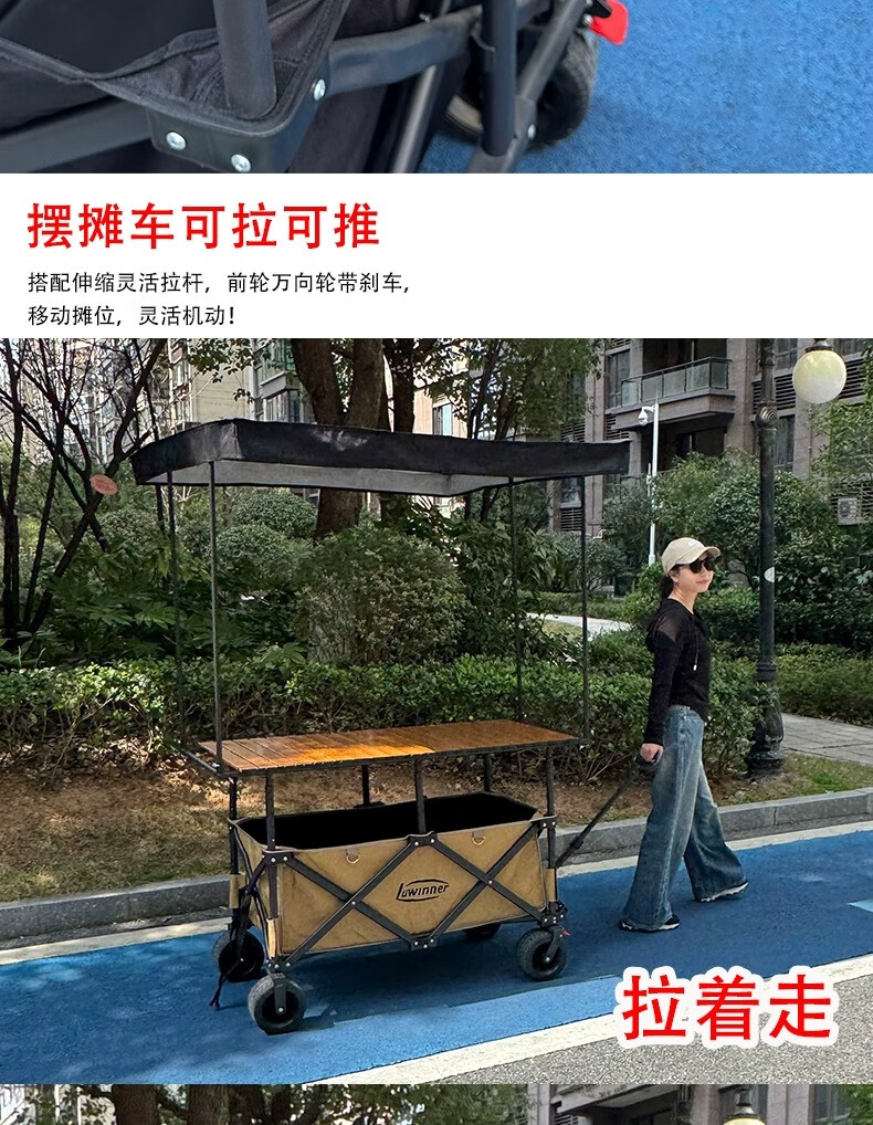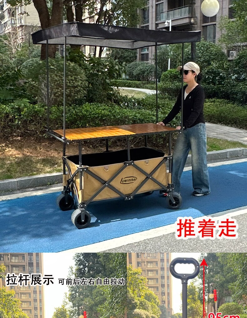 大号露营车摆摊车夜市小推车升降桌柠檬茶餐车营地野餐车聚拢折叠 车(黑)+167*60黑色桌+超大棚(黑)