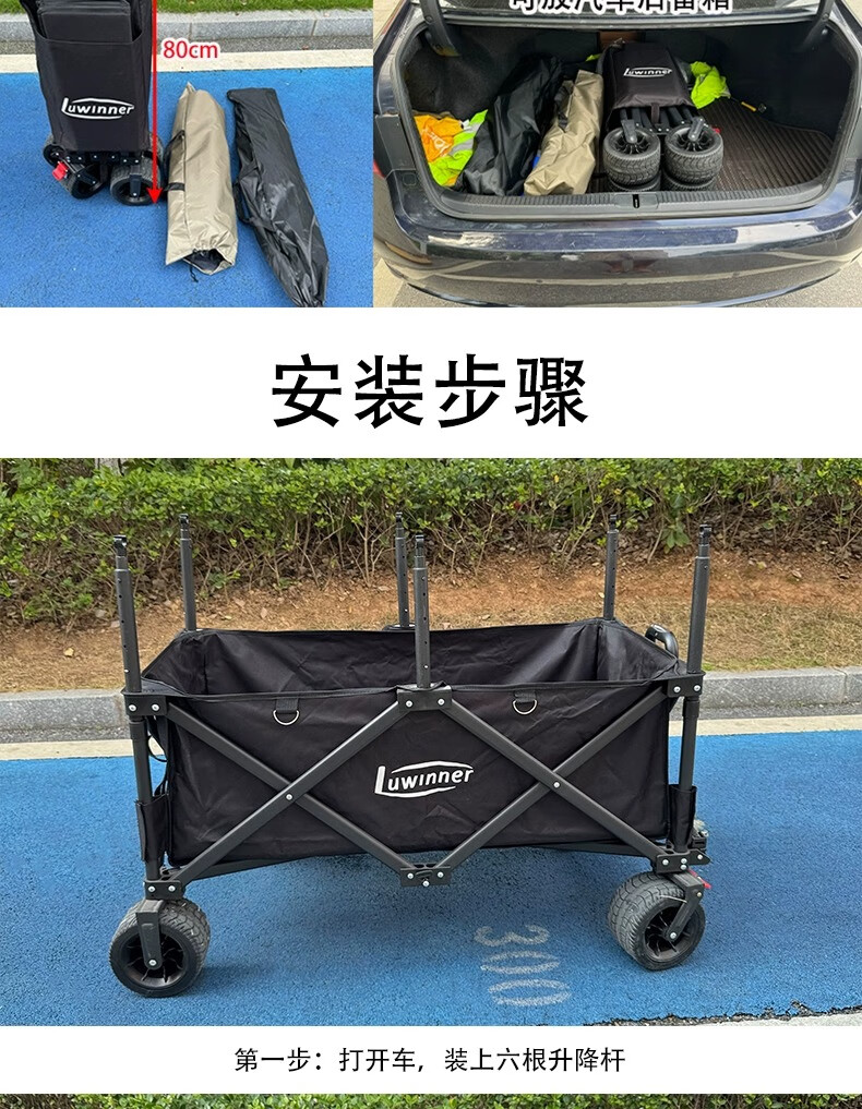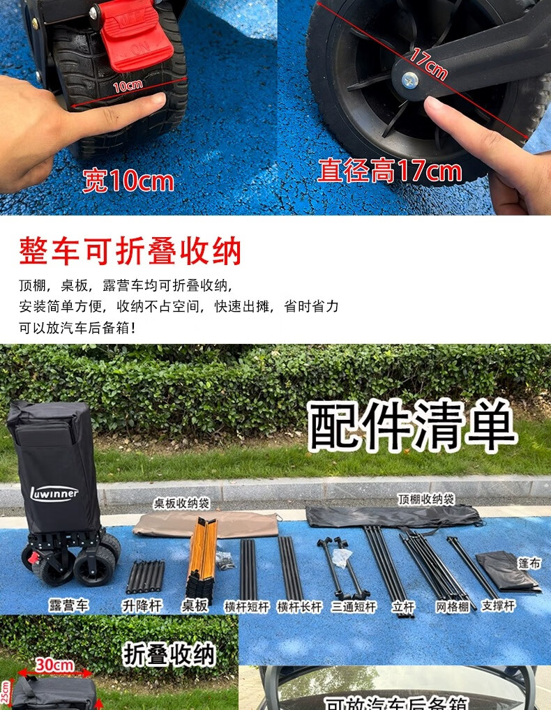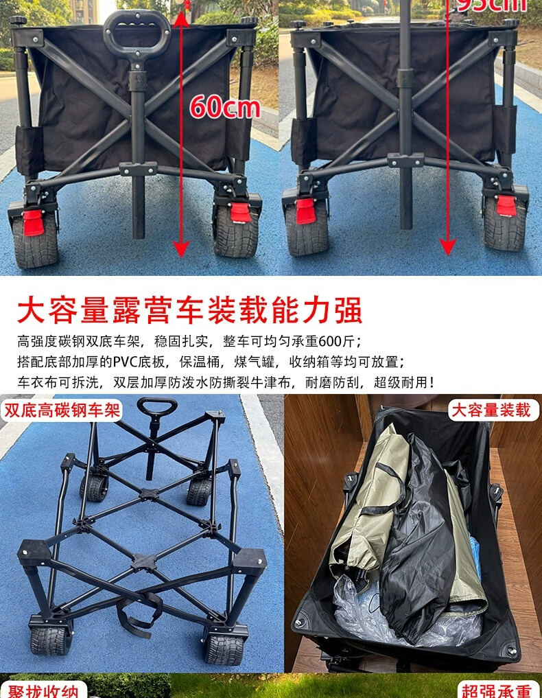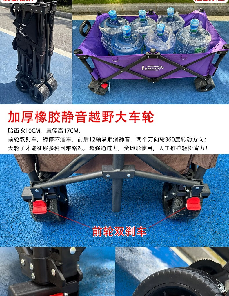 买第二次啦,这次给爸妈也备了一台。推起来特别省力,折叠方便不占地方,露营野餐装东西轻松自如。轮子顺滑,沙地石子路都稳。