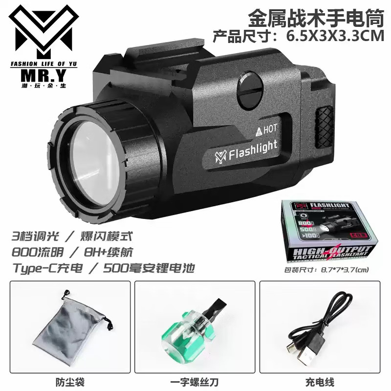 MRY合金下挂800LM常量爆闪双模式超长续航金属电手格洛克战术手电 金属款黑-800流明【送线送袋】