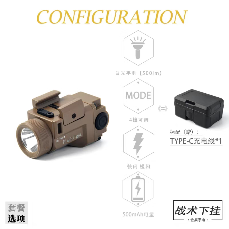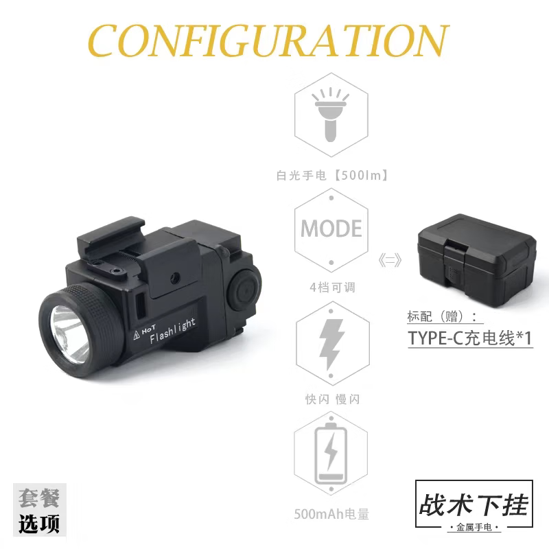 MRY合金下挂800LM常量爆闪双模式超长续航金属电手格洛克战术手电 金属款黑-爆闪白光+可调绿镭射【送收纳盒】