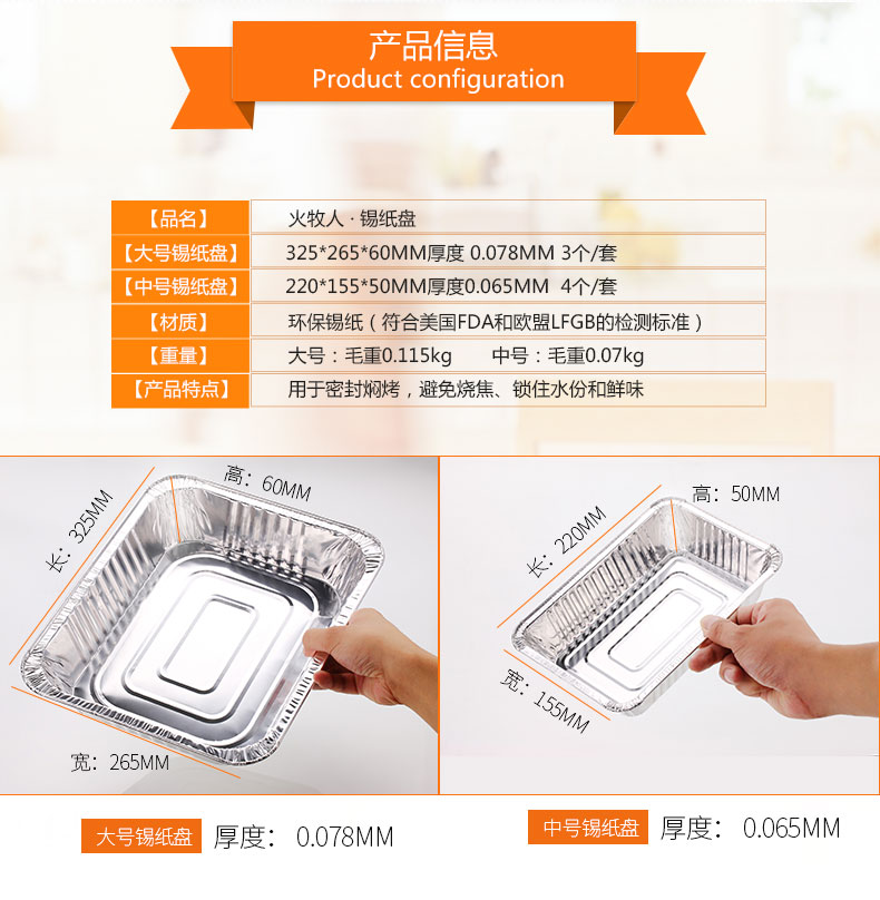 室内室外:室内室外都可以用,烤箱烧烤都可以用 用料材质:应该是锡纸 适用人数:大盘应该是3-5人都可以 重量大小:很轻,拿在手完全没重量 热源类型:全受热都可以 便携性能:方便,因为很轻 盘子够大,应该用了做烤鱼都可以的,应该3-5人的量都没问题,因为看起来蛮大的,快递在北京过来,有点远,但是也不慢